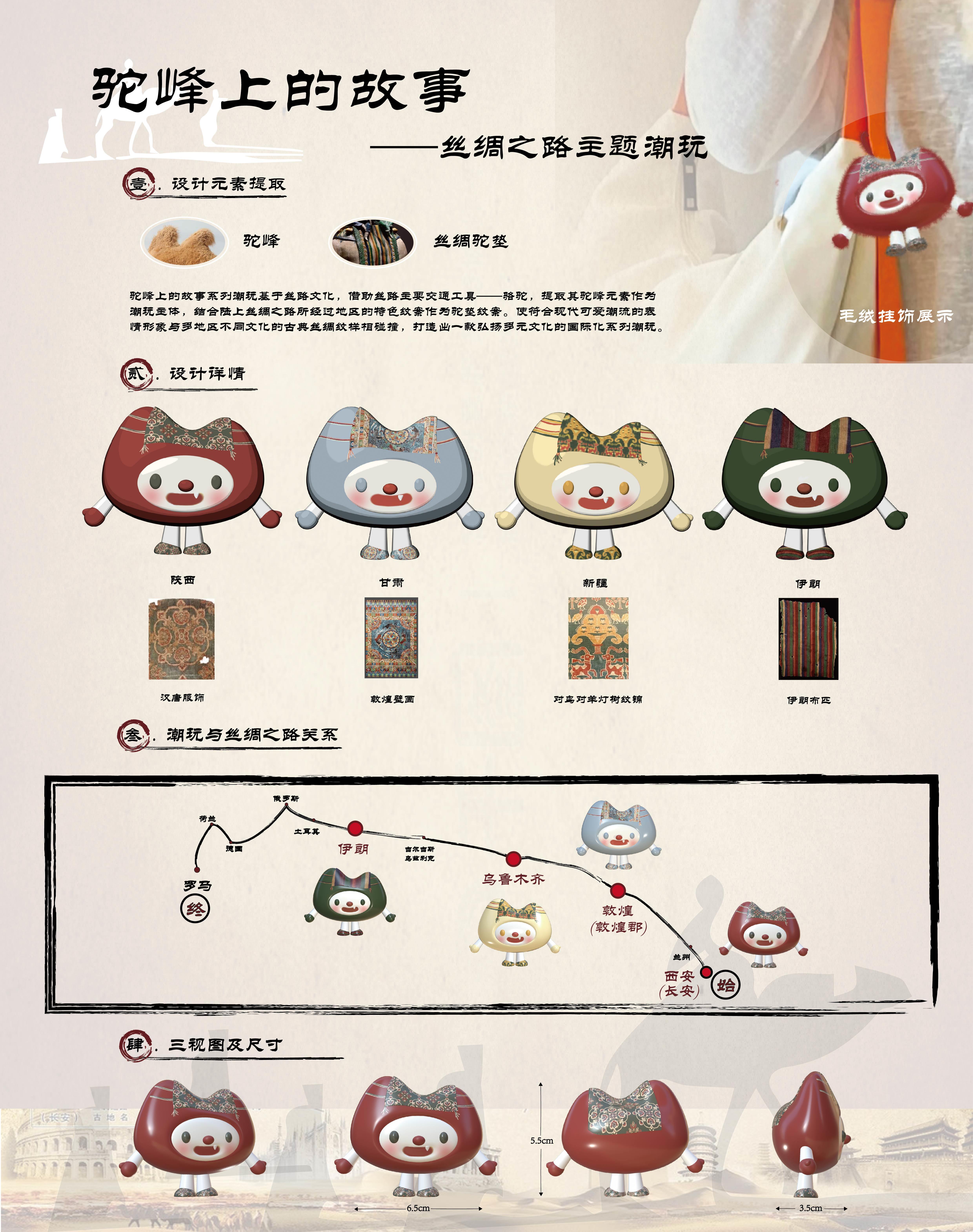 长安作为陆上丝绸之路的起点,孕育了浓厚的丝路文化。驼峰上的故事系列潮玩基于丝路文化,借助丝路主要交通工具-骆驼,提取其驼峰元素作无潮玩主体,结合陆上丝绸之路所经过地区的特色纹案作为驼垫纹案。使符合现代可爱潮流的表情形象与多地区不同文化的古典丝绸纹样相碰撞,打造出一款弘扬多元文化的国际化系列潮玩。