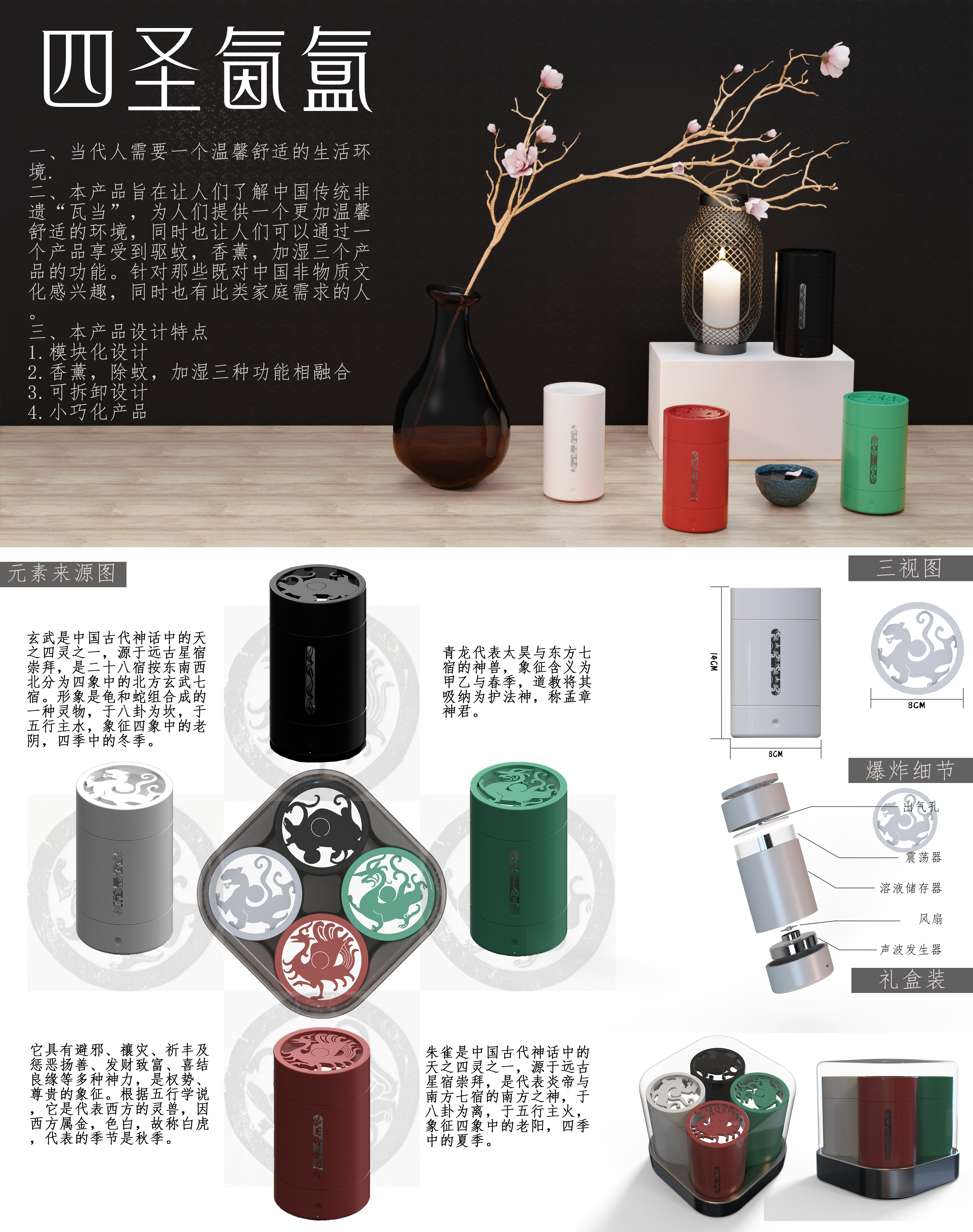 一、当代人需要一个温馨舒适的生活环境. 二、本产品旨在让人们了解中国传统非遗“瓦当”,为人们提供一个更加温馨舒适的环境,同时也让人们可以通过一个产品享受到驱蚊,香薰,加湿三个产品的功能。针对那些既对中国非物质文化感兴趣,同时也有此类家庭需求的人。 三、本产品设计特点 1.模块化设计 2.香薰,除蚊,加湿三种功能相融合 3.可拆卸设计 4.小巧化产品