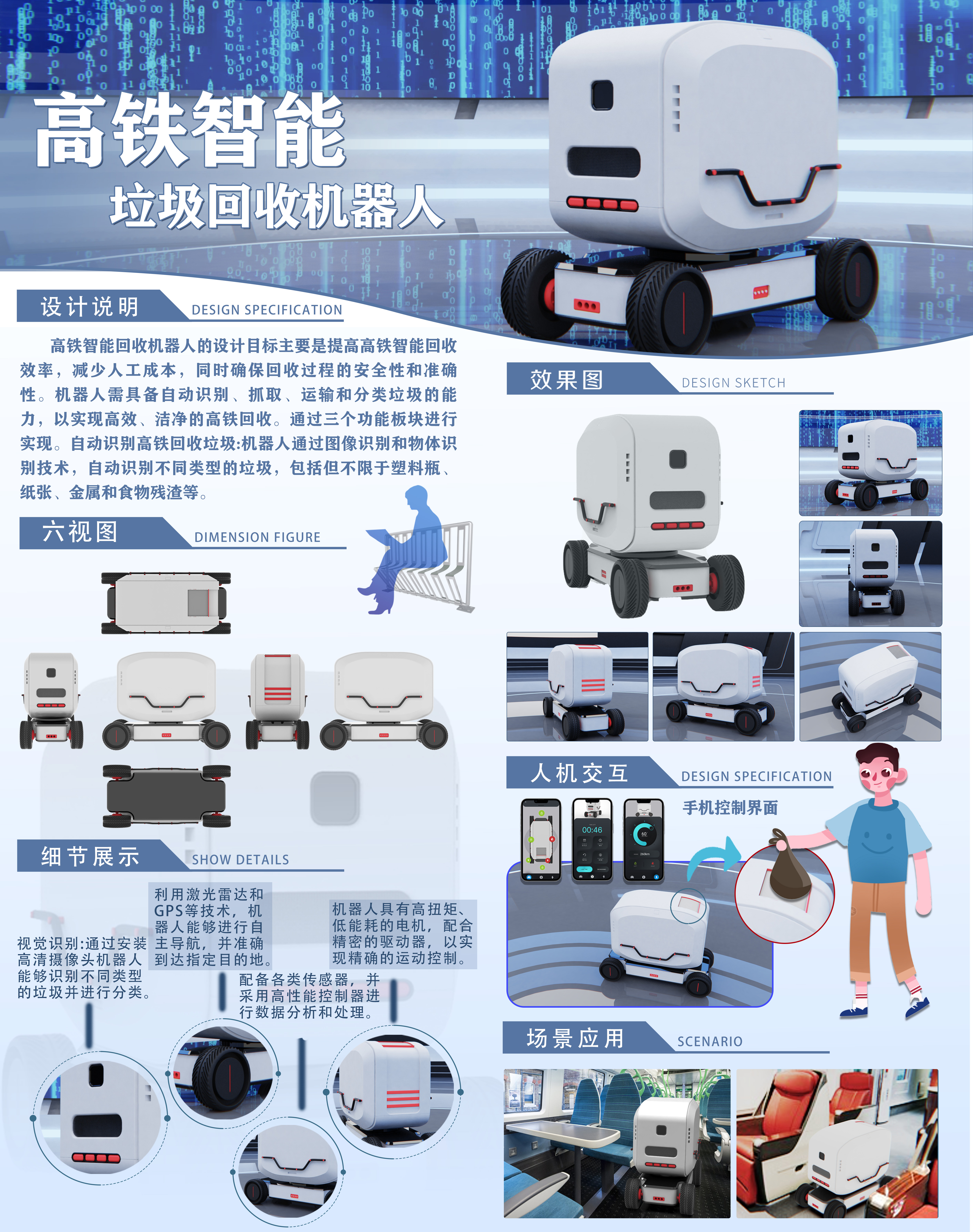 该设计目标主要是提高高铁垃圾的回收效率,减少人工成本,同时确保回收过程的安全性和准确性,具备自动识别、抓取、运输和分类垃圾的能力,以实现高效、洁净的方式进行垃圾回收,并具备自主导航和运动能力,能够将识别出的垃圾(塑料瓶、纸张、金属和食物残渣等)自动运输到指定的回收站。