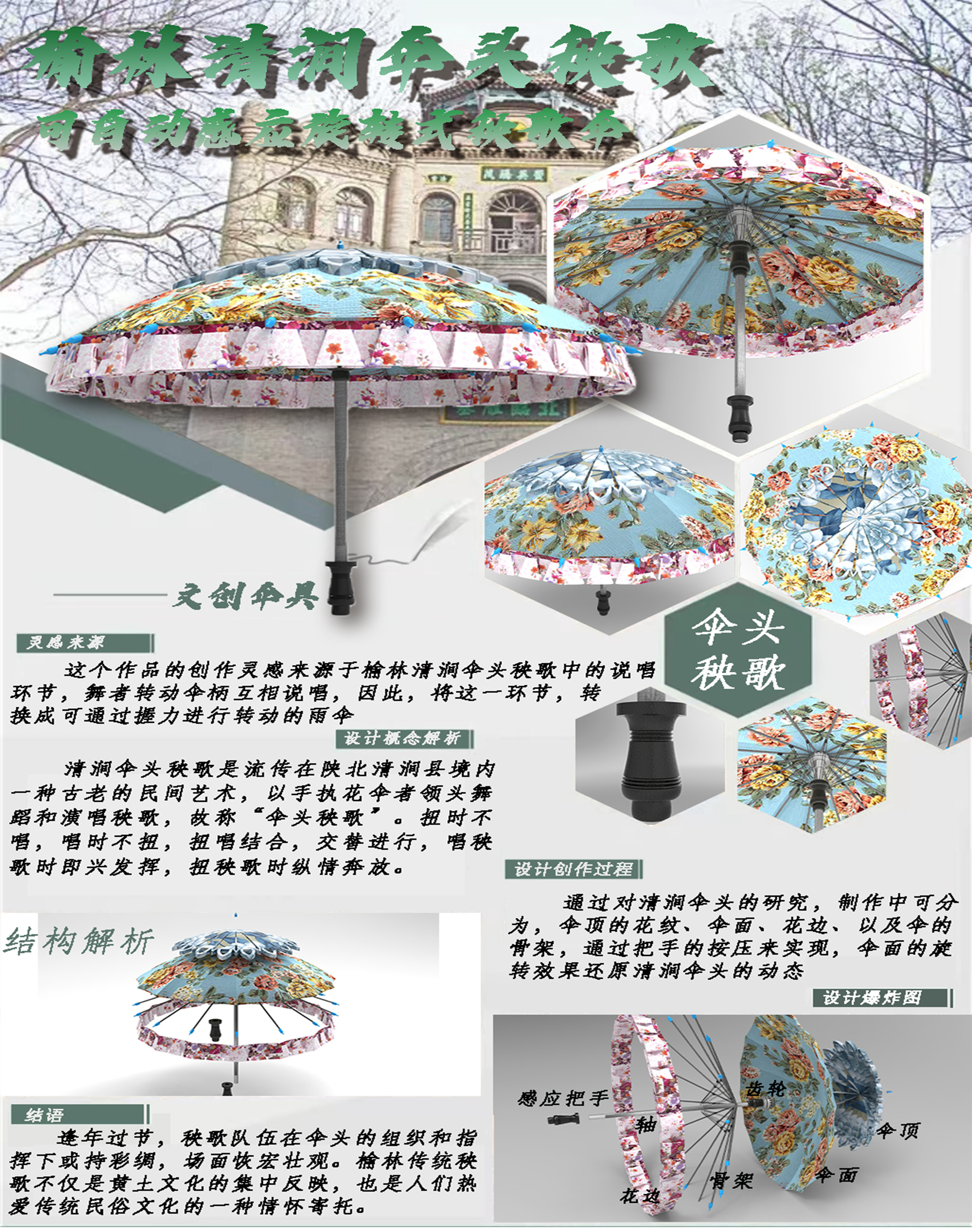 通过对清涧伞头的研究,制作中可分为,伞顶的花纹、伞面、花边、以及伞的骨架,通过把手的按压来实现,伞面的旋转效果还原清涧伞头的动态