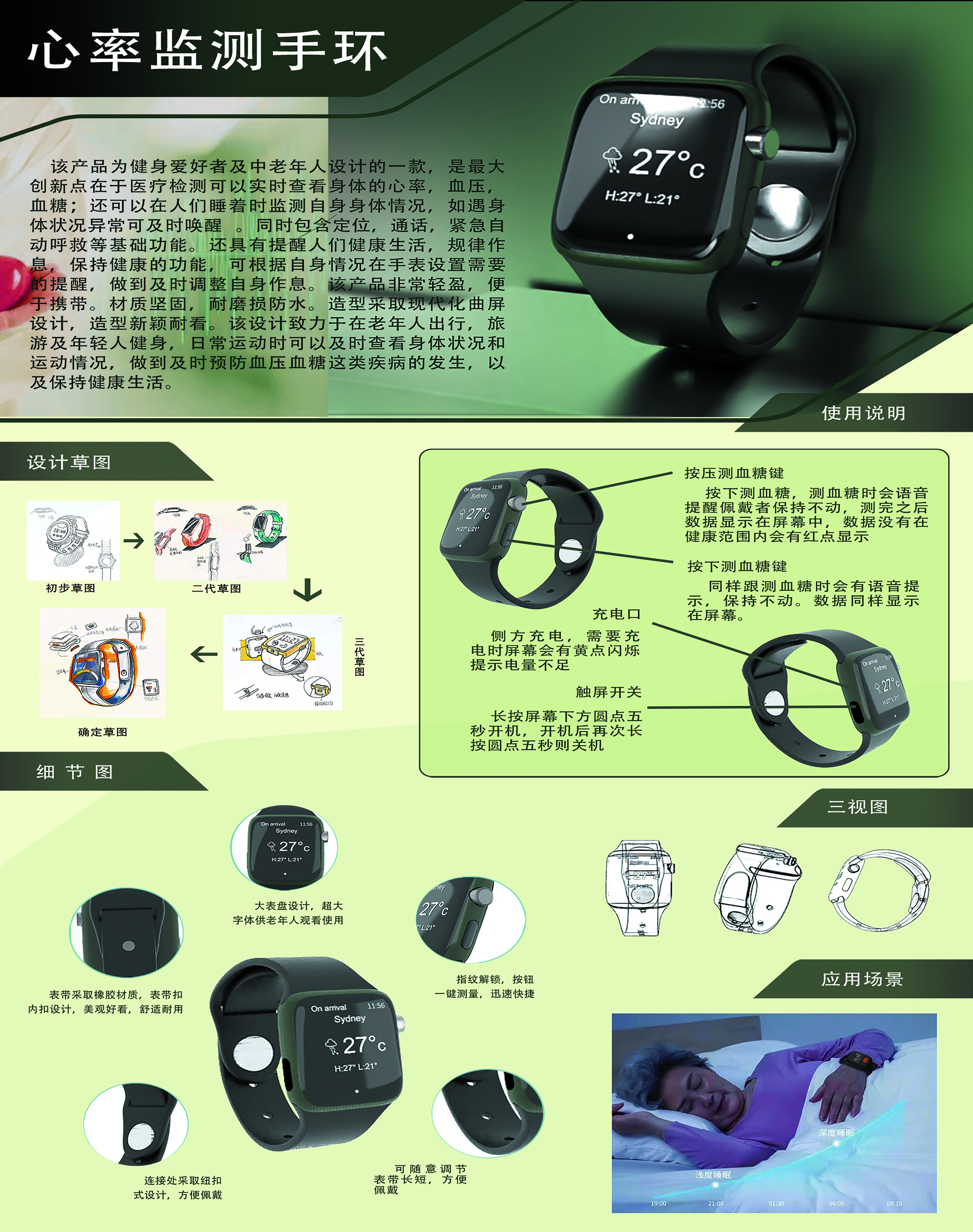 该产品为中老年人设计,造型采取现代化曲屏设计,最大创新点在于医疗检测,可以实时查看心率、血糖等,还可以在人们睡着时监测身体情况,如遇异常可及时提醒 。产品包含定位,通话,紧急自动呼救等基础功能,具有提醒人们健康生活,规律作息的功能,可根据自身情况在手表设置提醒,及时调整作息。该设计致力于在老年人日常出行时可以及时查看身体状况,做到及时预防血压血糖这类疾病的发生,保持健康生活。