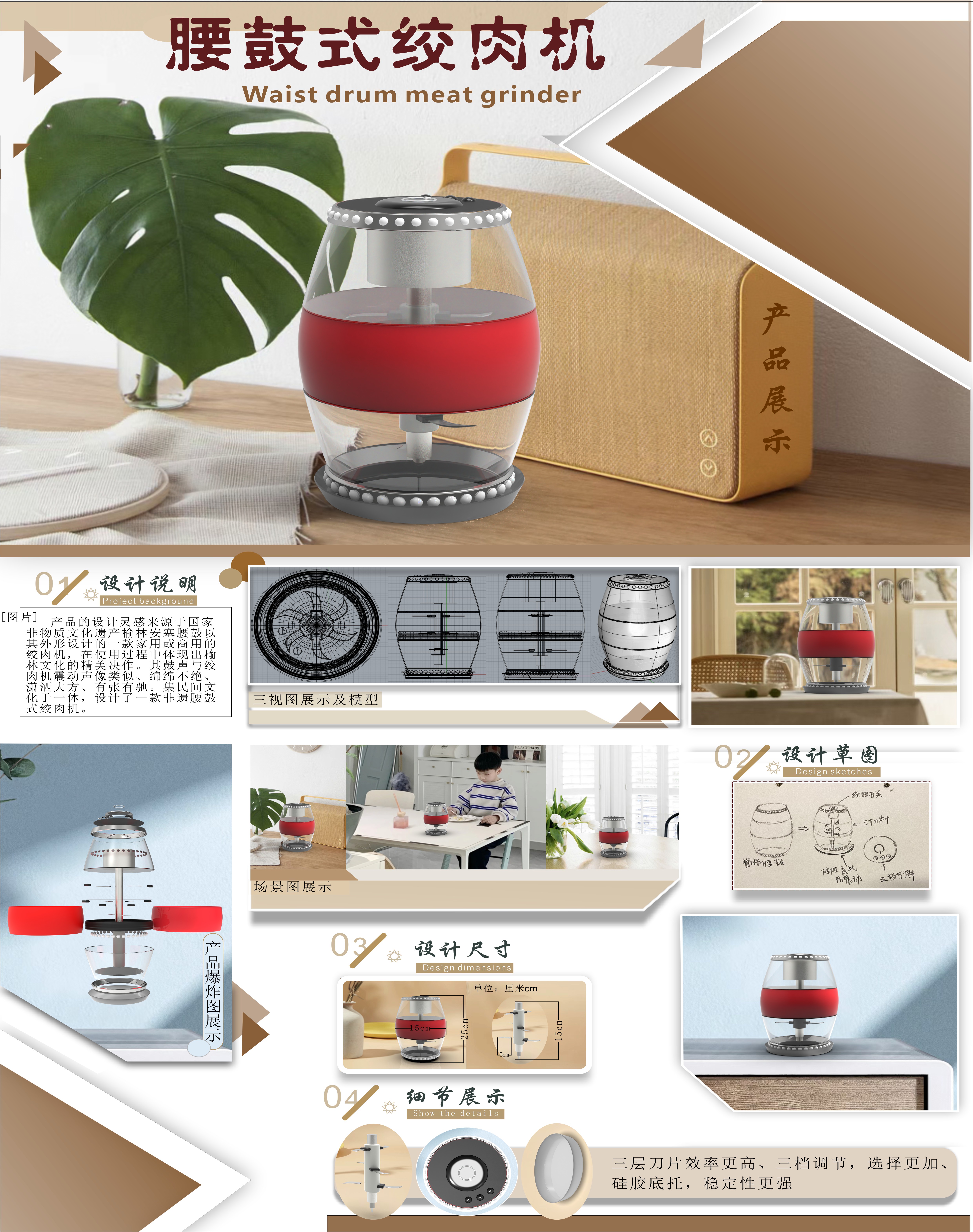 产品的设计灵感来源于国家非物质文化遗产榆林安塞腰鼓以其外形设计的一款家用或商用的绞肉机,在使用过程中体现出榆林文化的精美决作。其鼓声与绞肉机震动声像类似、绵绵不绝、潇洒大方、有张有驰。集民间文化于一体,设计了一款非遗腰鼓式绞肉机。