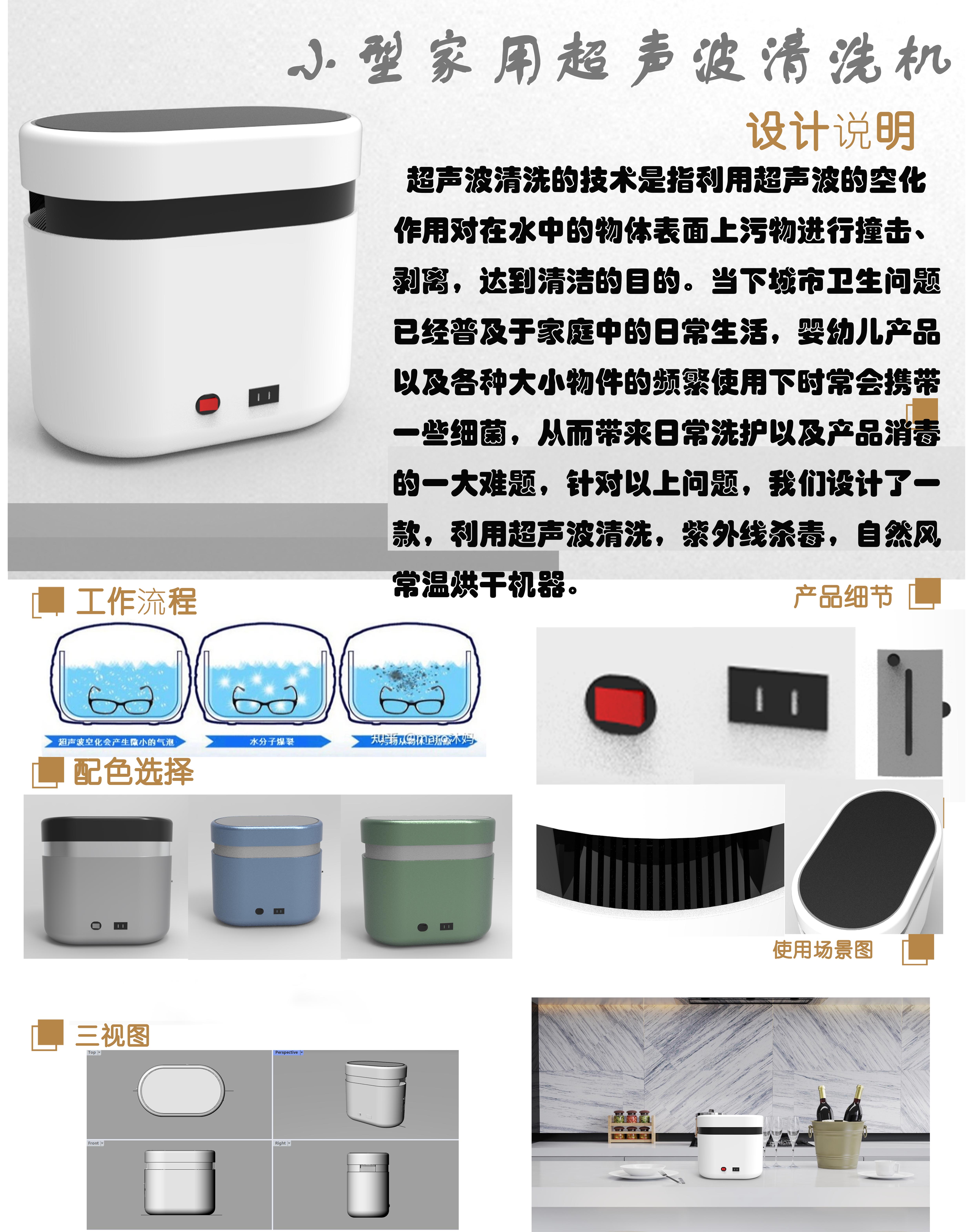超声波清洗的技术是指利用超声波的空化作用对在水中的物体表面上污物进行撞击、剥离,达到清洁的目的。当下城市卫生问题已经普及于家庭中的日常生活,婴幼儿产品以及各种大小物件的频繁使用下时常会携带一些细菌,从而带来日常洗护以及产品消毒的一大难题,针对以上问题,我们设计了一款,利用超声波清洗,紫外线杀毒,自然风常温烘干机器。