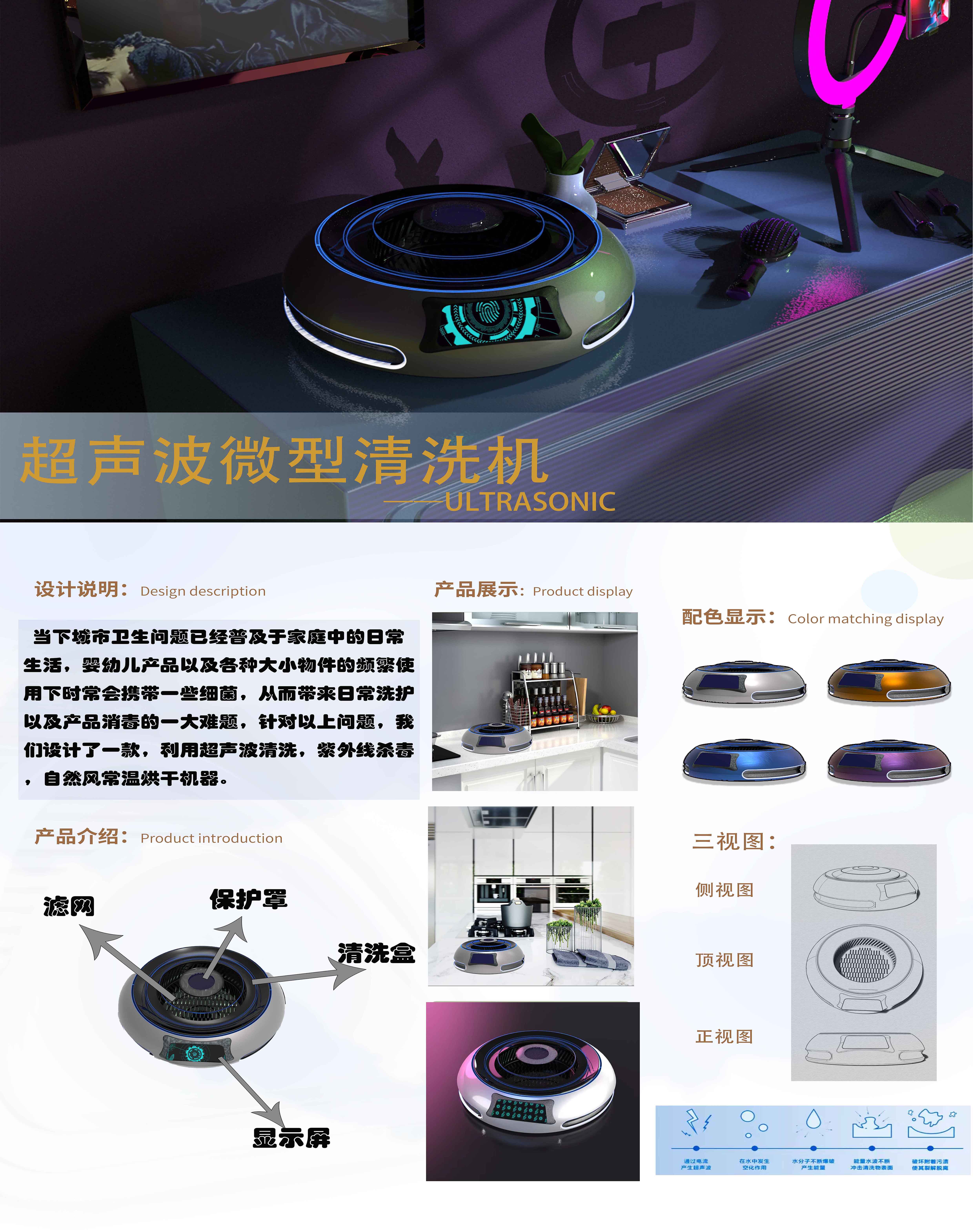 当下城市卫生问题已经普及于家庭中的日常生活,婴幼儿产品以及各种大小物件的频繁使用下时常会携带一些细菌,从而带来日常洗扩以及产品消毒的一大难题,针对以上问题,我们设计了一款,利用超声波清洗,紫外线杀毒自然风常温烘干机器。