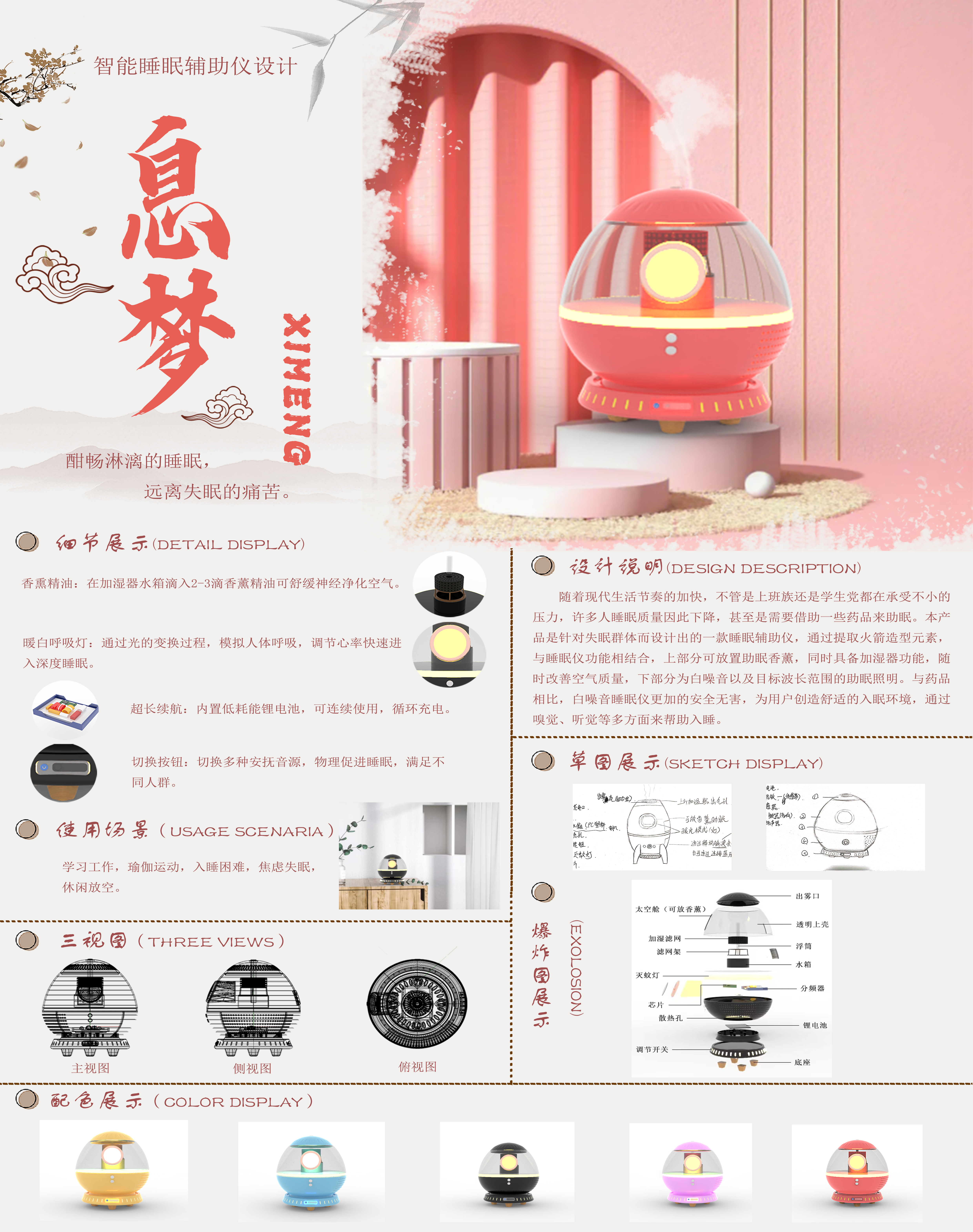 随着现代生活节奏的加快,不管是上班族还是学生党都在承受不小的压力,许多人睡眠质量下降,甚至需要借助一些药品来助眠。本产品是针对失眠群体而设计出的一款睡眠辅助仪,通过提取火箭造型元素,与睡眠仪功能相结合,上部分可放置助眠香薰,同时具备加湿器功能,改善空气质量,下部分为白噪音以及目标波长范围的助眠照明。与药品相比,白噪音睡眠仪更加安全无害,为用户创造舒适的入眠环境,通过嗅觉、听觉等多方面来帮助入睡。