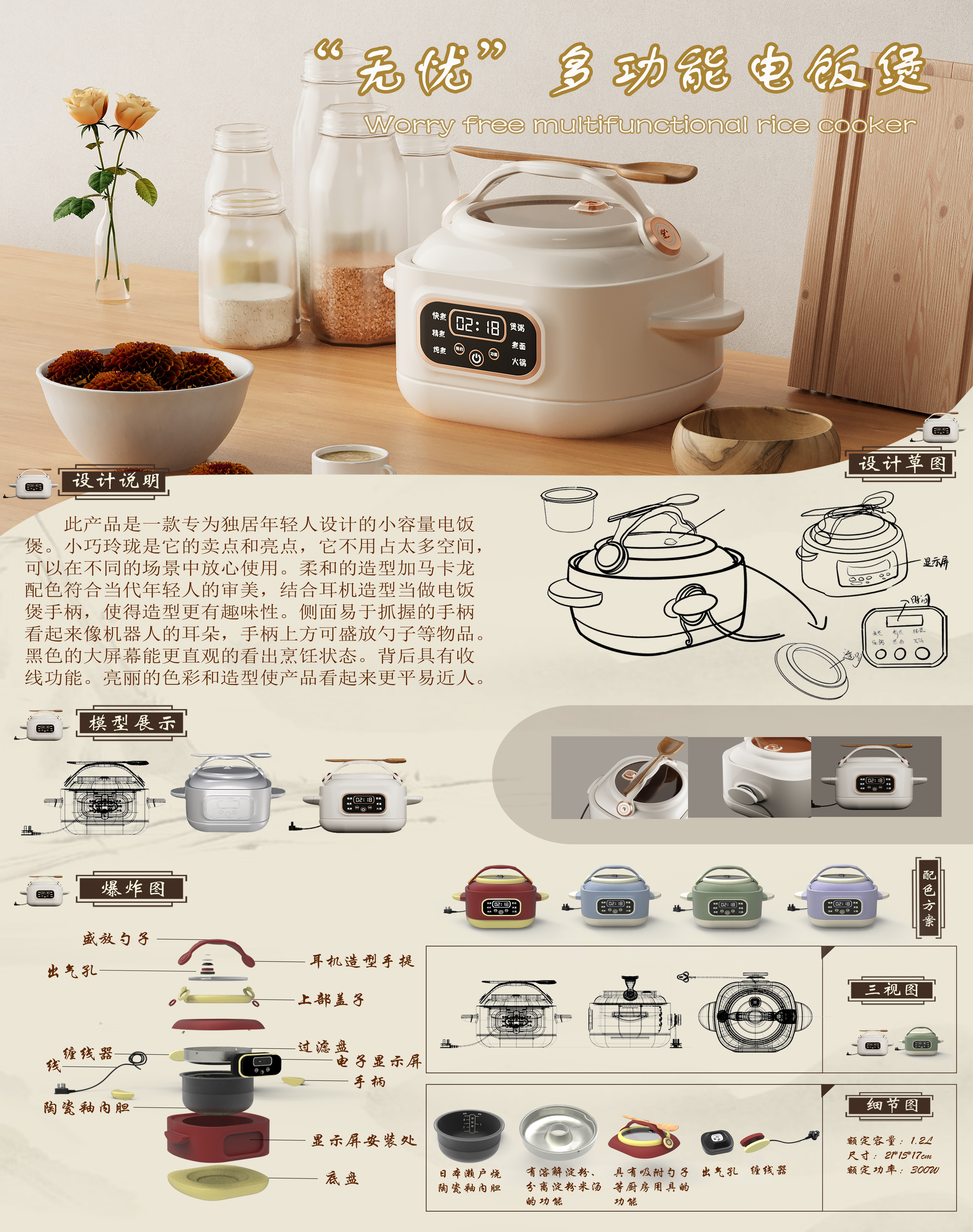 此产品是一款专为独居年轻人设计的小容量电饭煲。小巧玲珑是它的卖点和亮点,它不用占太多空间,可以在不同的场景中放心使用。柔和的造型加马卡龙配色符合当代年轻人的审美,结合耳机造型当做电饭煲手柄,使得造型更有趣味性。侧面易于抓握的手柄看起来像机器人的耳朵,手柄上方可盛放勺子等物品。黑色的大屏幕能更直观的看出烹饪状态。背后具有收线功能。亮丽的色彩和造型使产品看起来更平易近人。