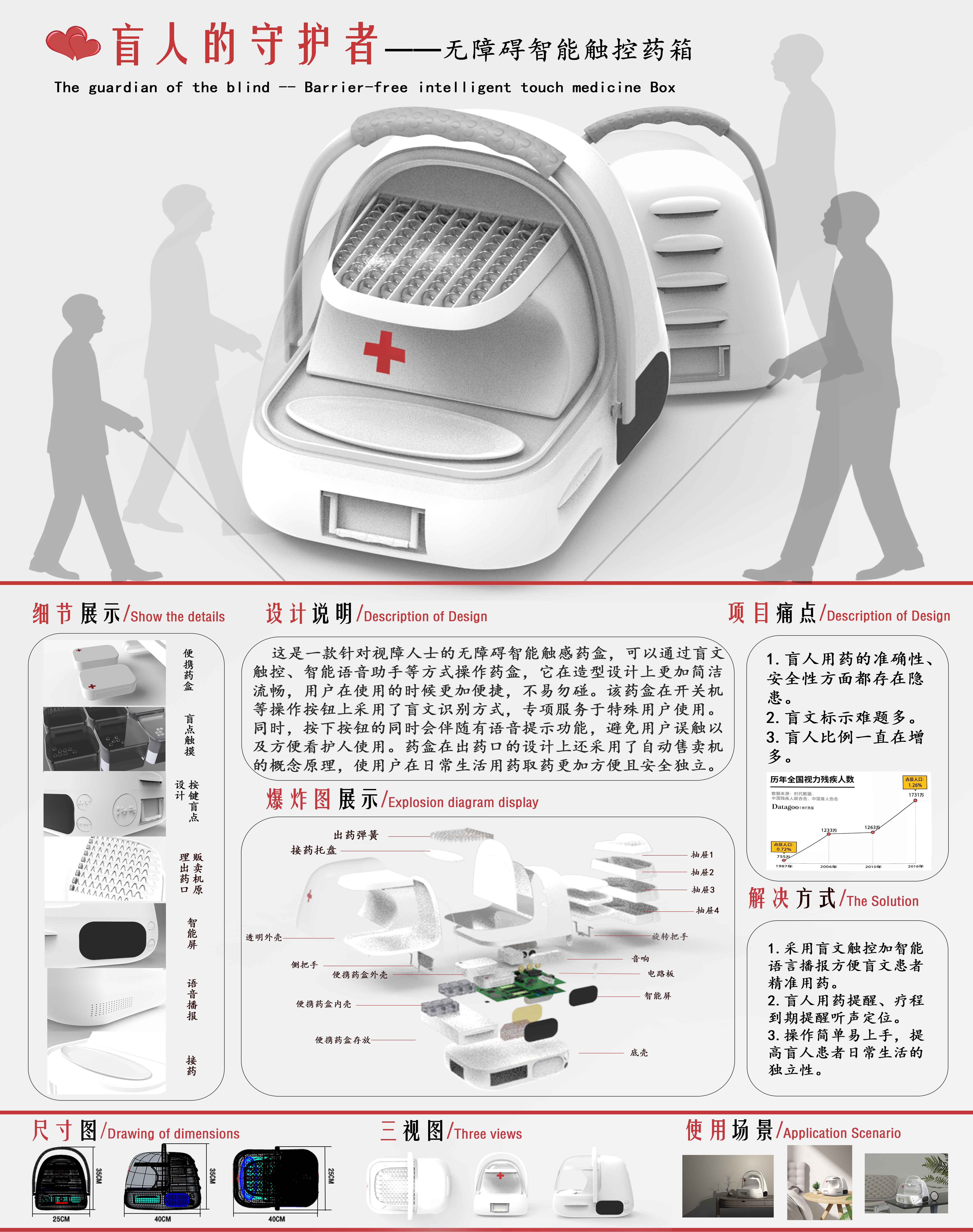 这是一款针对视障人士的无障碍智能触感药盒,可以通过盲文触控、智能语音助手等方式操作药盒,它在造型设计上更加简洁流畅,用户在使用的时候更加便捷,不易勿碰。该药盒在开关机等操作按钮上采用了盲文识别方式,专项服务于特殊用户使用。同时,按下按钮的同时会伴随有语音提示功能,避免用户误触以及方便看护人使用。药盒在出药口的设计上还采用了自动售卖机的概念原理,使用户在日常生活用药取药更加方便且安全独立。