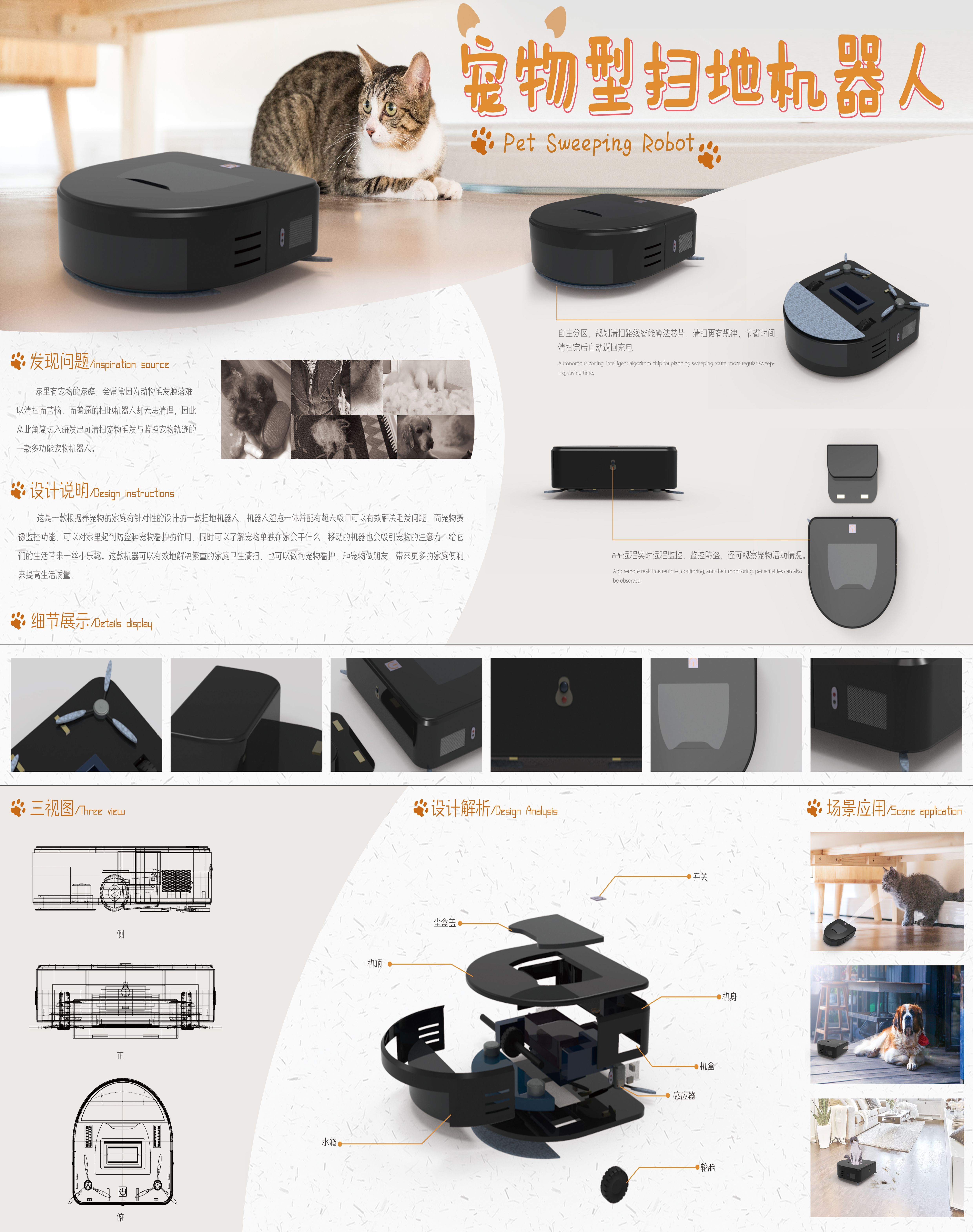 这是一款根据养宠物的家庭有针对性的设计一款扫地机器人,机器人湿拖一体并配有超大吸口可以有效解决毛发问题,而宠物摄像监控功能,可以对家里起到防盗和宠物看护作用,同时可以了解宠物单独在家会干什么,移动的机器也会吸引宠物的注意力,给它们的生活带来一丝小乐趣。这款机器人可以有效地解决繁重的家庭卫生清扫,也可以做到宠物看护,和宠物做朋友,带来更多的家庭便利来提高生活质量。