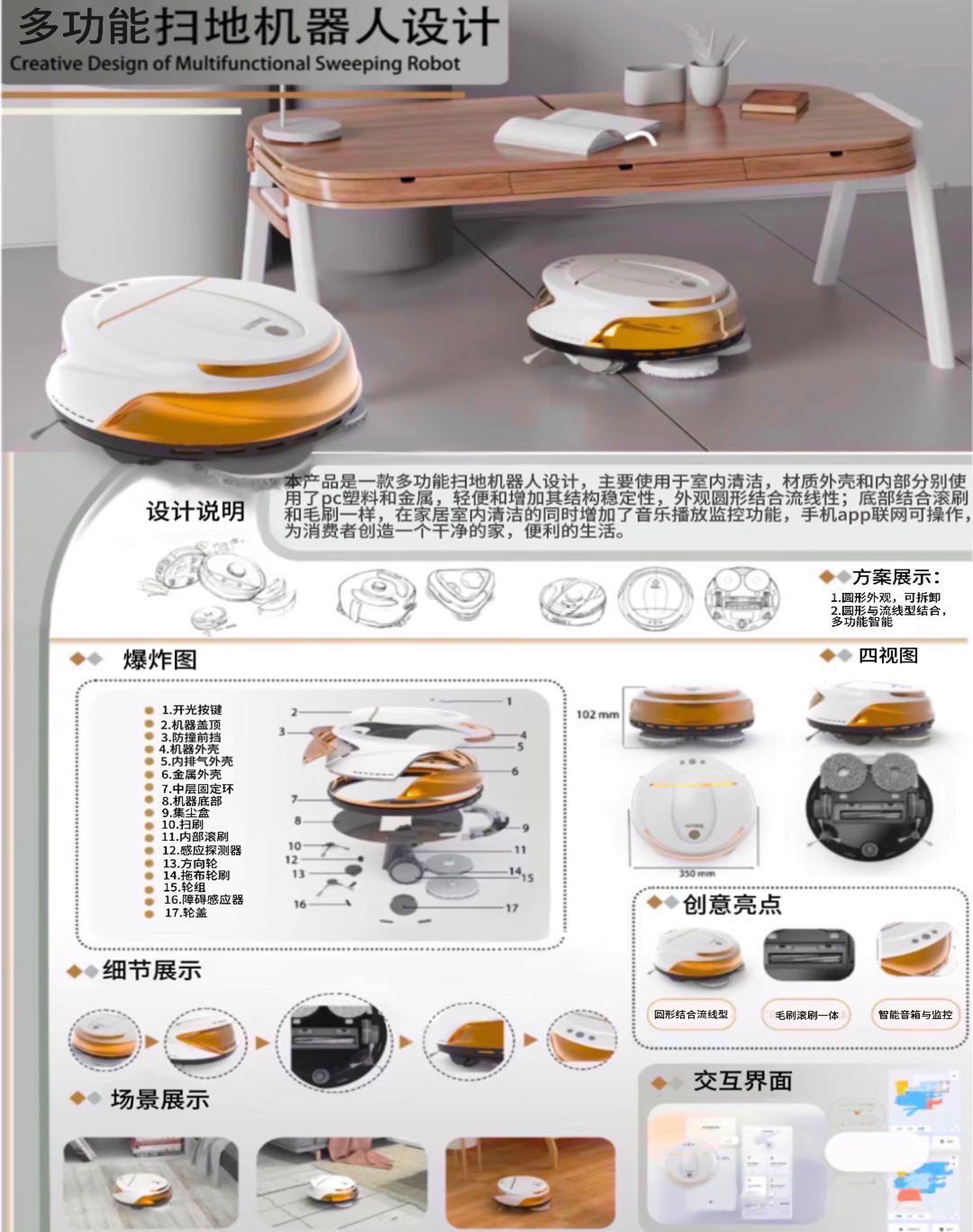 生活逐渐年轻化,年轻人的工作繁忙,打扫卫生的时间不多,扫地机器人让年轻人解放双手节省出更多的时间。扫地机器人符合时代的趋势,做到了人机交互。本产品是一款多功能扫地机器人设计,主要适用于室内清洁,材质轻便和增加其结构稳定性,外观圆形结合流线性;底部结合滚刷和毛刷一样。清洁的同时增加了音乐播放蓝控功能,手机app联网可操作,为消费者创造一个干净的家,便利的生活。