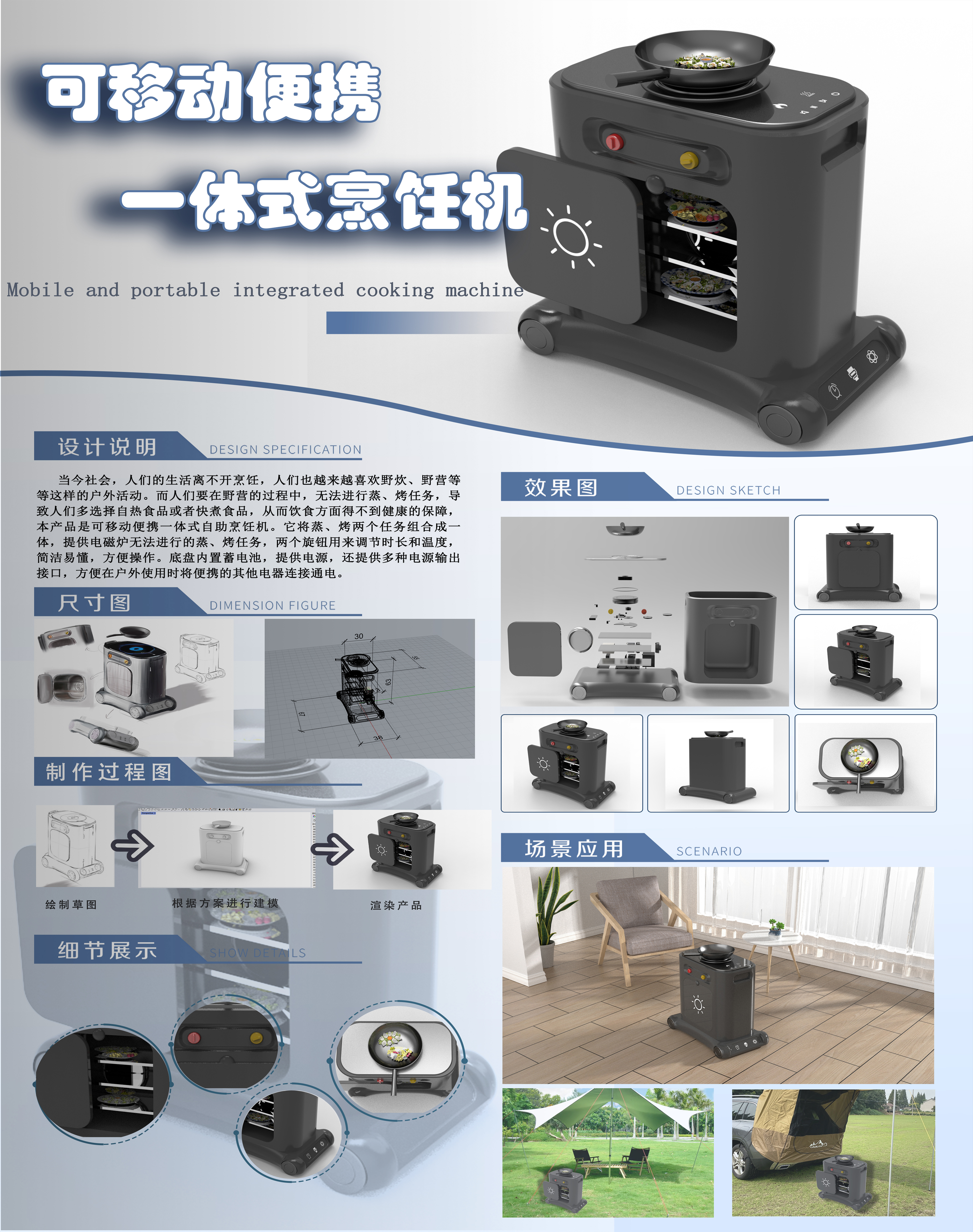 当今社会,人们越来越喜欢野炊、野营等等这样的户外活动。而人们要在野营的过程中,无法进行蒸、烤任务,导致人们多选择自热食品或者快煮食品,饮食方面得不到健康保障,本产品是可移动便携一体式自助烹饪机。它将蒸、烤两个任务组合成一体,提供电磁炉无法进行的蒸、烤任务,两个旋钮用来调节时长和温度,简洁易懂,方便操作。底盘内置蓄电池,提供电源,还提供多种电源输出 接口,方便在户外使用时将便携的其他电器连接通电。