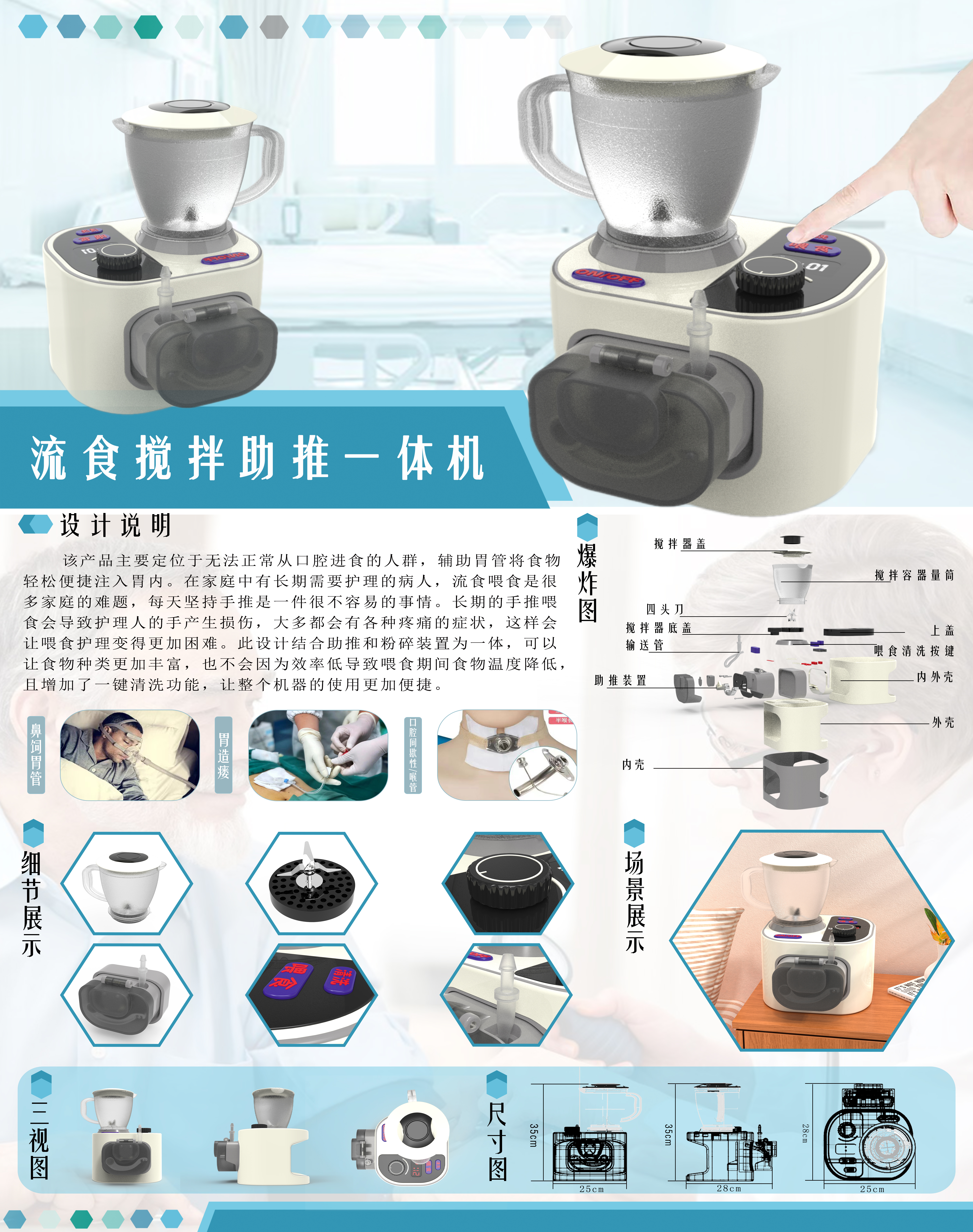 该产品主要定位于无法正常从口腔进食的人群,辅助胃管将食物轻松便捷注入胃内。在家庭中有长期需要护理的病人,流食喂食是很多家庭的难题,长期的手推喂食会导致护理人的手产生损伤,大多都会有各种疼痛的症状,这样会让喂食护理变得更加困难。此设计结合助推和粉碎装置为一体,可以让食物种类更加丰富,也不会因为效率低导致喂食期间食物温度降低,且增加了一键清洗功能,让整个机器的使用更加便捷。