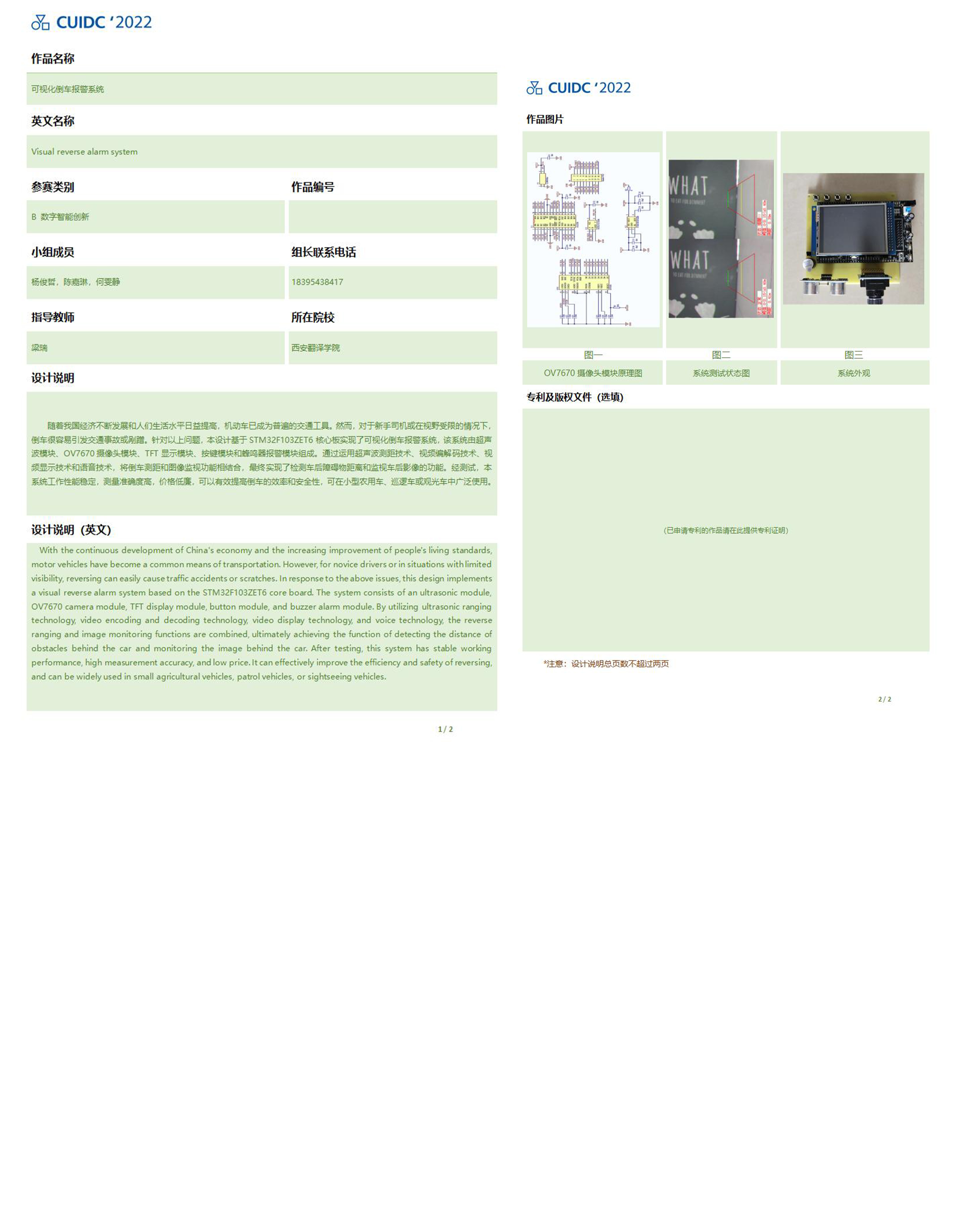 机动车成为普遍的交通工具。但对于新手司机或在视野受限的情况,倒车很容易引发交通事故或剐蹭。针对以上问题,本设计基于STM32F103ZET6实现了可视化倒车报警系统,系统由超声波模块、OV7670摄像头模块、TFT显示模块、按键模块和蜂鸣器报警模块组成。通过运用超声波测距技术、视频编解码技术、视频显示技术和语音技术,将倒车测距和图像监视功能相结合,最终实现了检测车后障碍物距离和监视车后影像的功能。