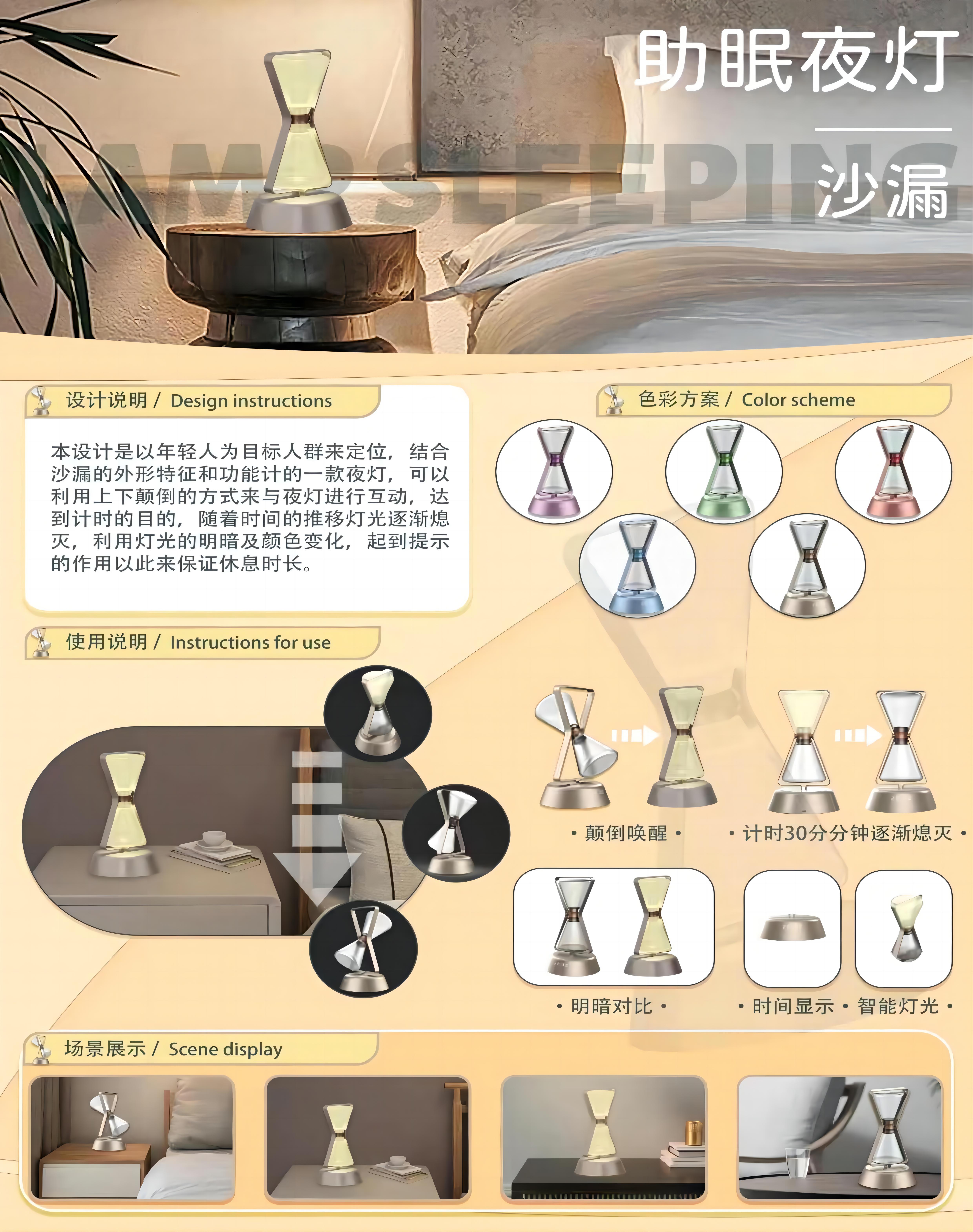 本设计是以年轻人为目标人群来定位,结合沙漏的外形特征和功能计的一款夜灯,可以利用上下颠倒的方式来与夜灯进行互动,达到计时的目的,随着时间的推移灯光逐渐熄灭,利用灯光的明暗及颜色变化,起到提示的作用以此来保证休息时长。