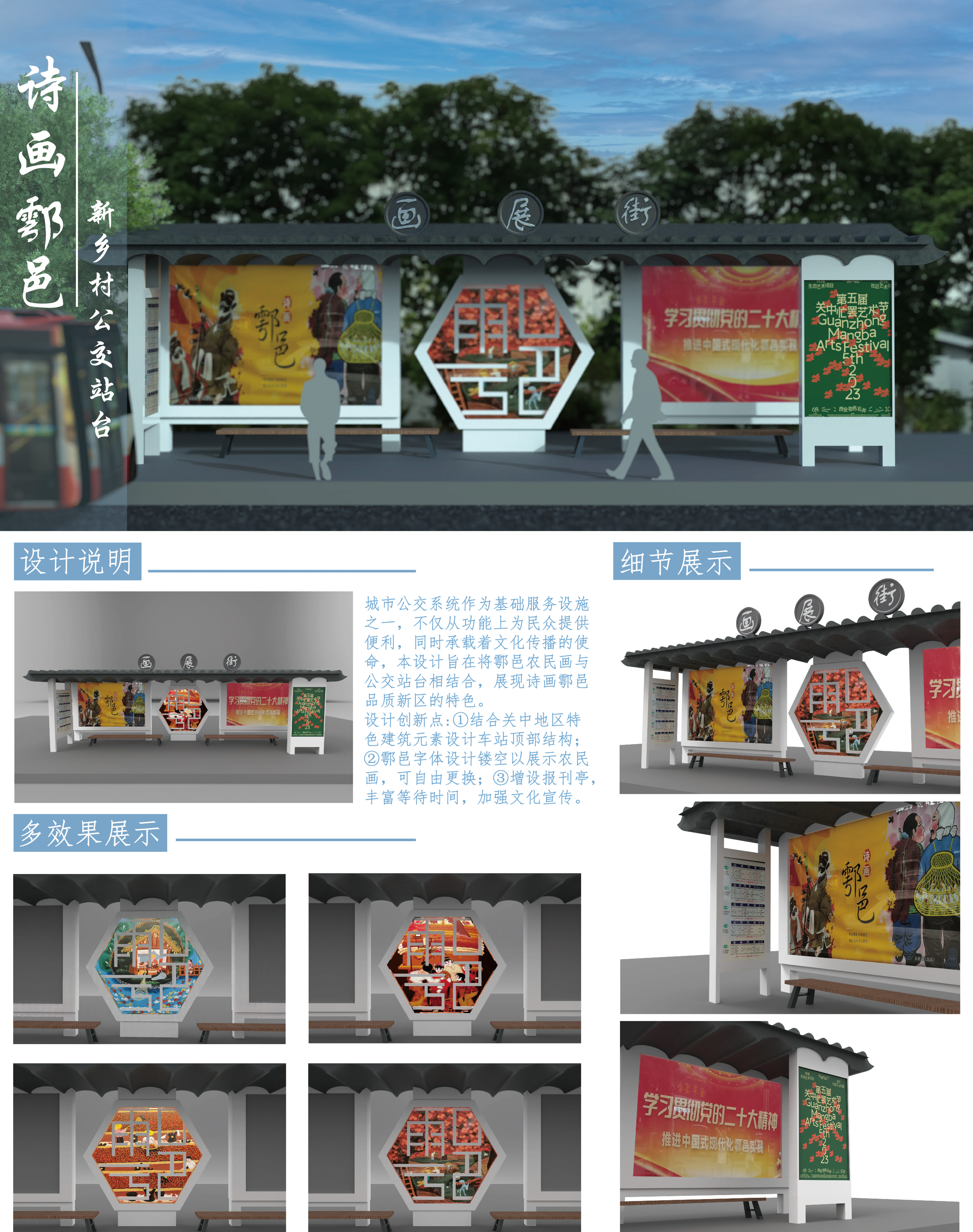 城市公交系统作为基础服务设施之一,不仅从功能上为民众提供便利,同时承载着文化传播的使命,本设计旨在将鄠邑农民画与公交站台相结合,展现诗画鄠邑品质新区的特色。 设计创新点:①结合关中地区特色建筑元素设计车站顶部结构;②鄠邑字体设计镂空以展示农民画,可自由更换;③增设报刊亭,丰富等待时间,加强文化宣传。