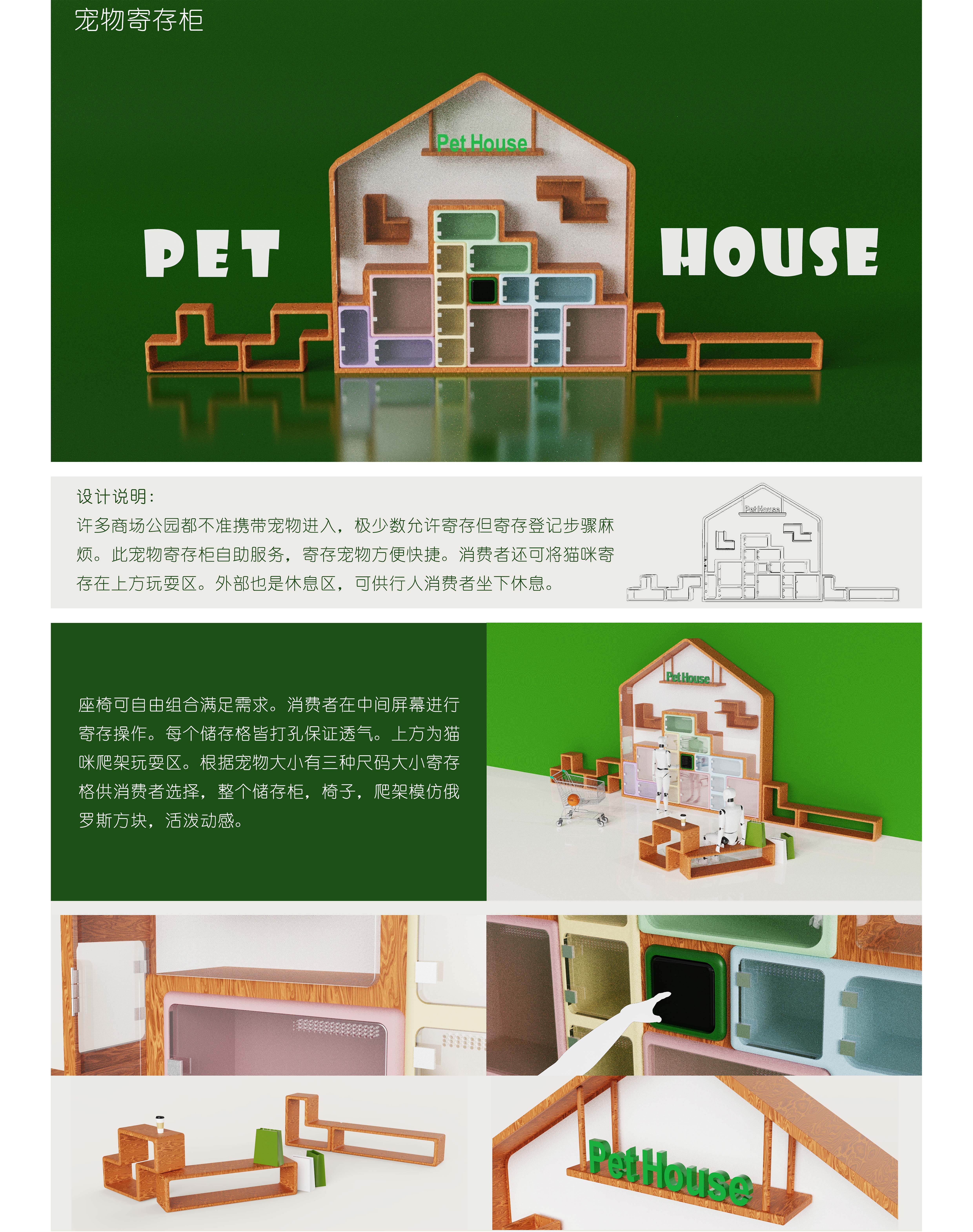 许多商场公园都不准携带宠物进入,极少数允许寄存但寄存登记步骤麻烦。因此设计宠物寄存柜,提供宠物寄存自助服务,寄存宠物方便快捷。消费者还可将猫咪寄存在上方玩耍区。外部也是休息区,可供行人消费者坐下休息。