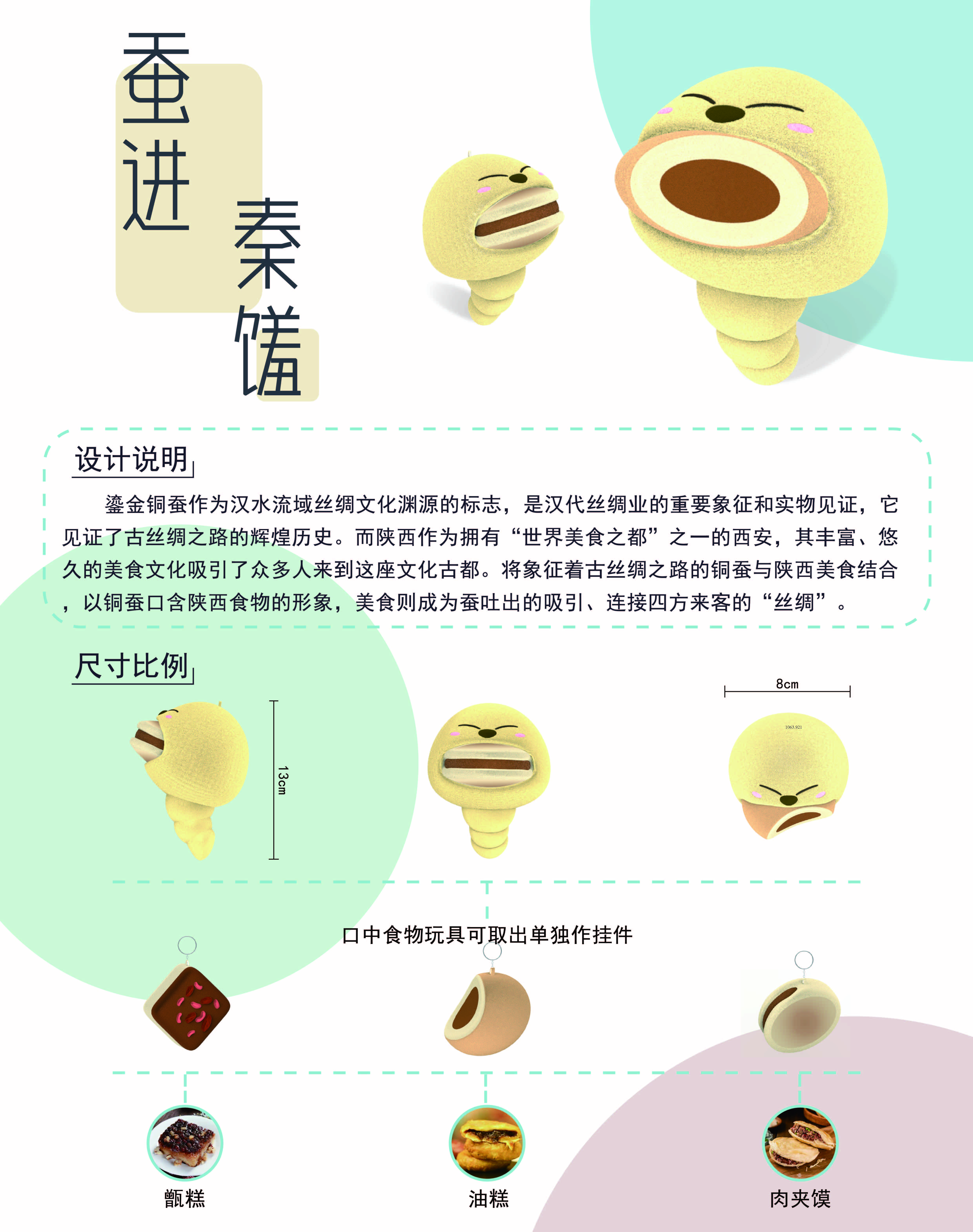 此设计将鎏金铜蚕与陕西特色美食结合,鎏金铜蚕作为汉水流域丝绸文化渊源的标志,是汉代丝绸业的重要象征和实物见证,它见证了古丝绸之路的辉煌历史。而陕西作为拥有“世界美食之都”之一的西安,其丰富、悠久的美食文化吸引了众多人来到这座文化古都。将象征着古丝绸之路的铜蚕与陕西美食结合,以铜蚕口含陕西食物的形象,美食则成为蚕吐出的吸引、连接四方来客的“丝绸”。