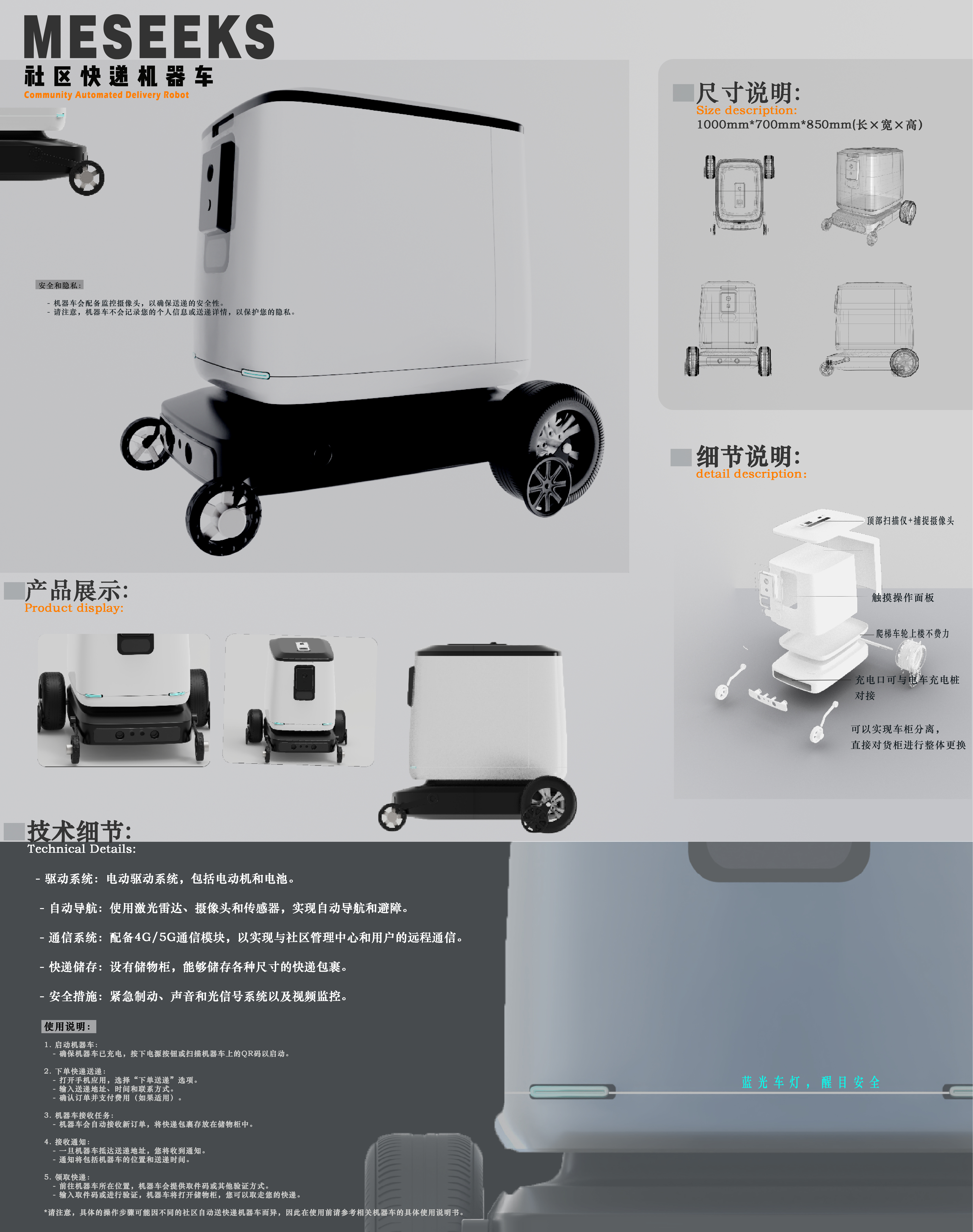 社区自动送快递机器车旨提供更便捷的快递送达体验。该机器车拥有简洁的外观,采用电动驱动系统,搭载激光雷达、摄像头和传感器等自动导航技术,能够自主导航和避障。用户可以通过手机应用选择送递地址和时间,机器车自动执行送递任务。为了确保安全,机器车设有紧急制动、声音和光信号系统以及视频监控。用户可以根据自己的需求选择送递时间,该产品的核心是提供便捷性,减少等待时间和交通拥堵。
