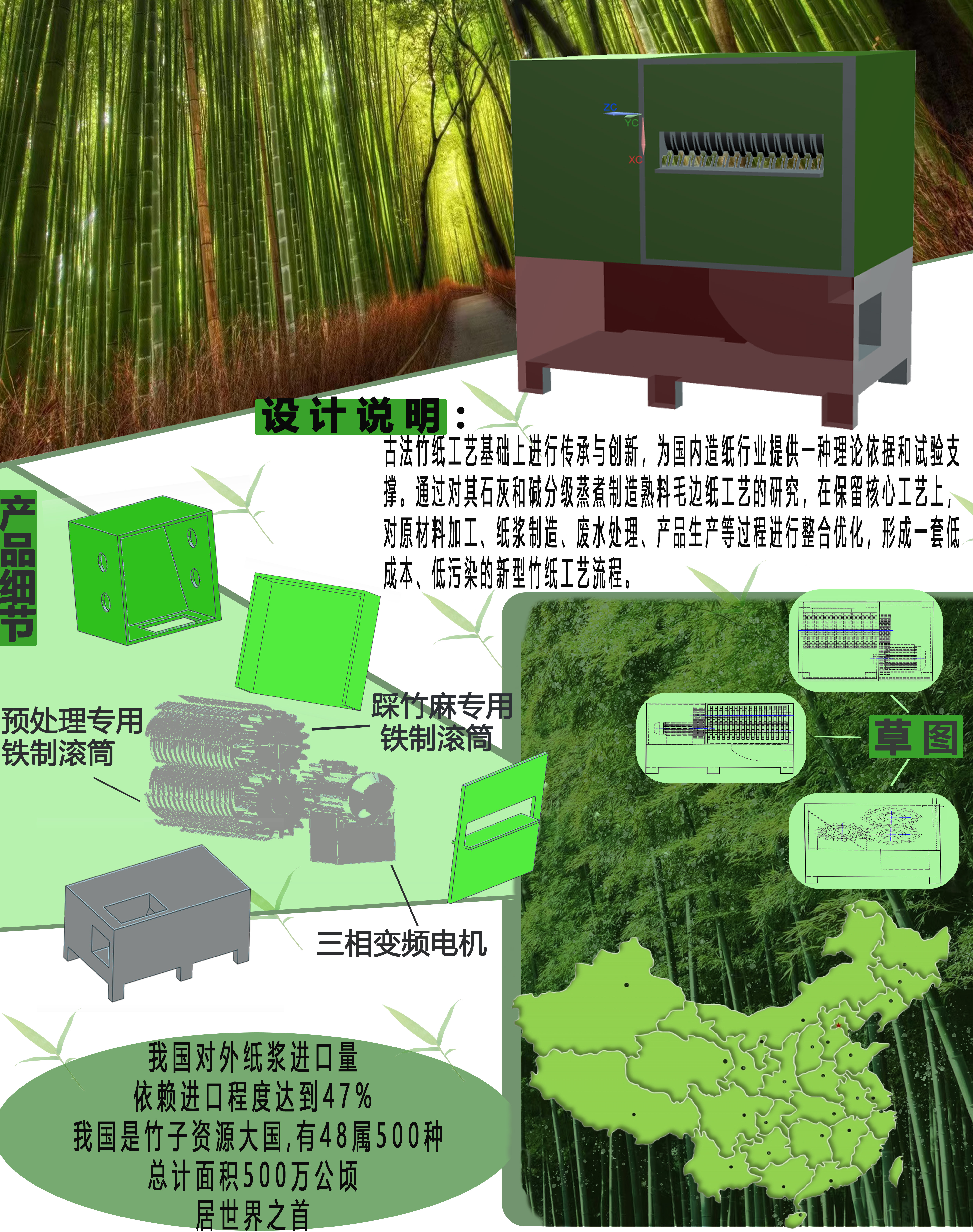 采用竹子作为造纸原料可以极大缓解我国纸浆对外依赖程度。在传统古法竹纸工艺基础上进行传承与创新,通过对其石灰和碱分级蒸煮制造熟料毛边纸工艺的研究,在保留核心工艺上,对原材料加工/纸浆制造/废水处理/生产等整合优化,形成一套低成本、低污染的新型竹纸工艺流程。该方案能实现废水低于国家标准;解决其成本高的问题;实现造纸户最低营收从1.8万元/户提高至7.5万元/户,直接或者间接带动就业人数近百人。