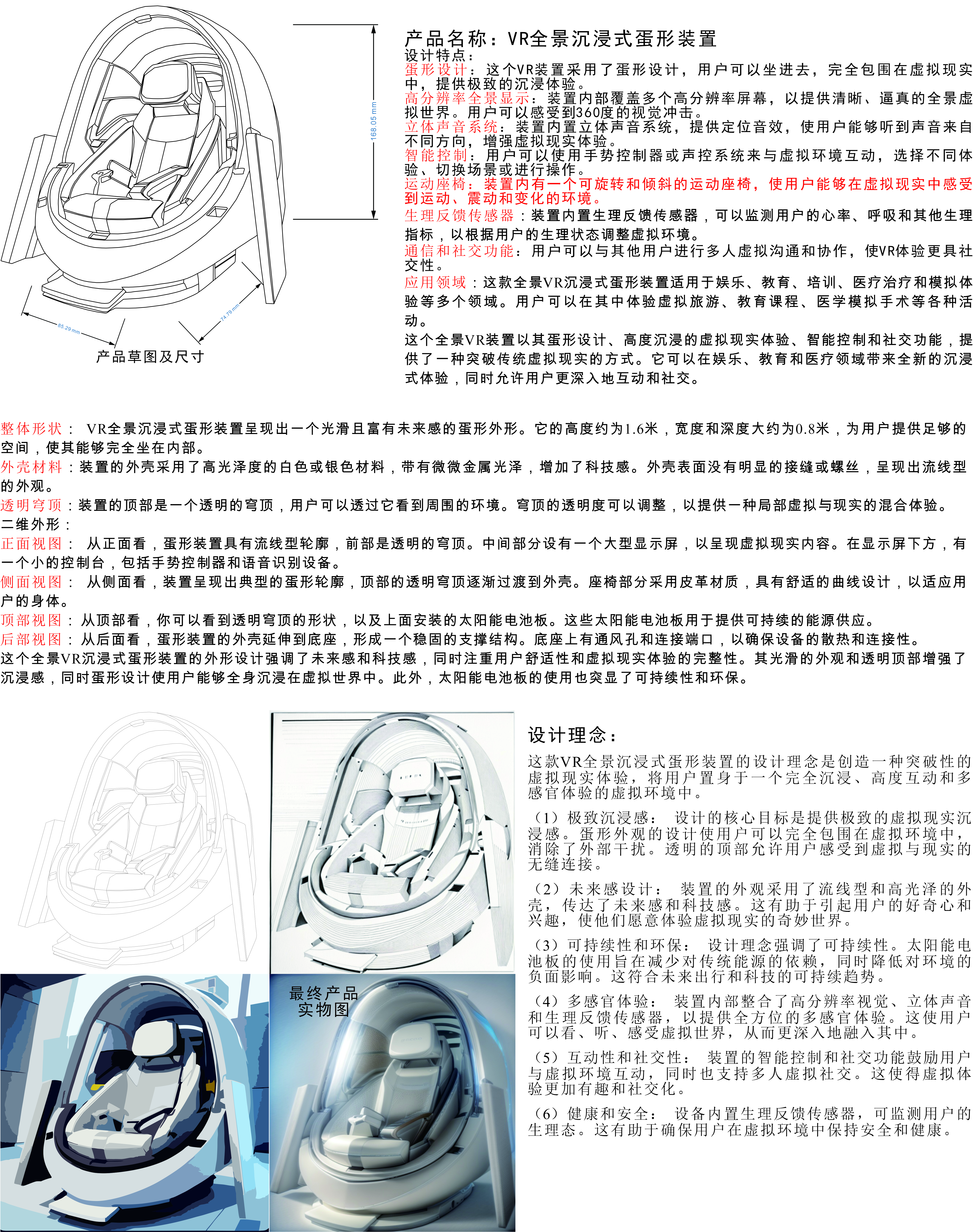 这个全景VR沉浸式蛋形装置的外形设计强调了未来感和科技感,同时注重用户舒适性和虚拟现实体验的完整性。其光滑的外观和透明顶部增强了沉浸感,同时蛋形设计使用户置身于一个完全沉浸、高度互动和多感官体验的虚拟环境中。此外,太阳能电池板的使用也突显了可持续性和环保。