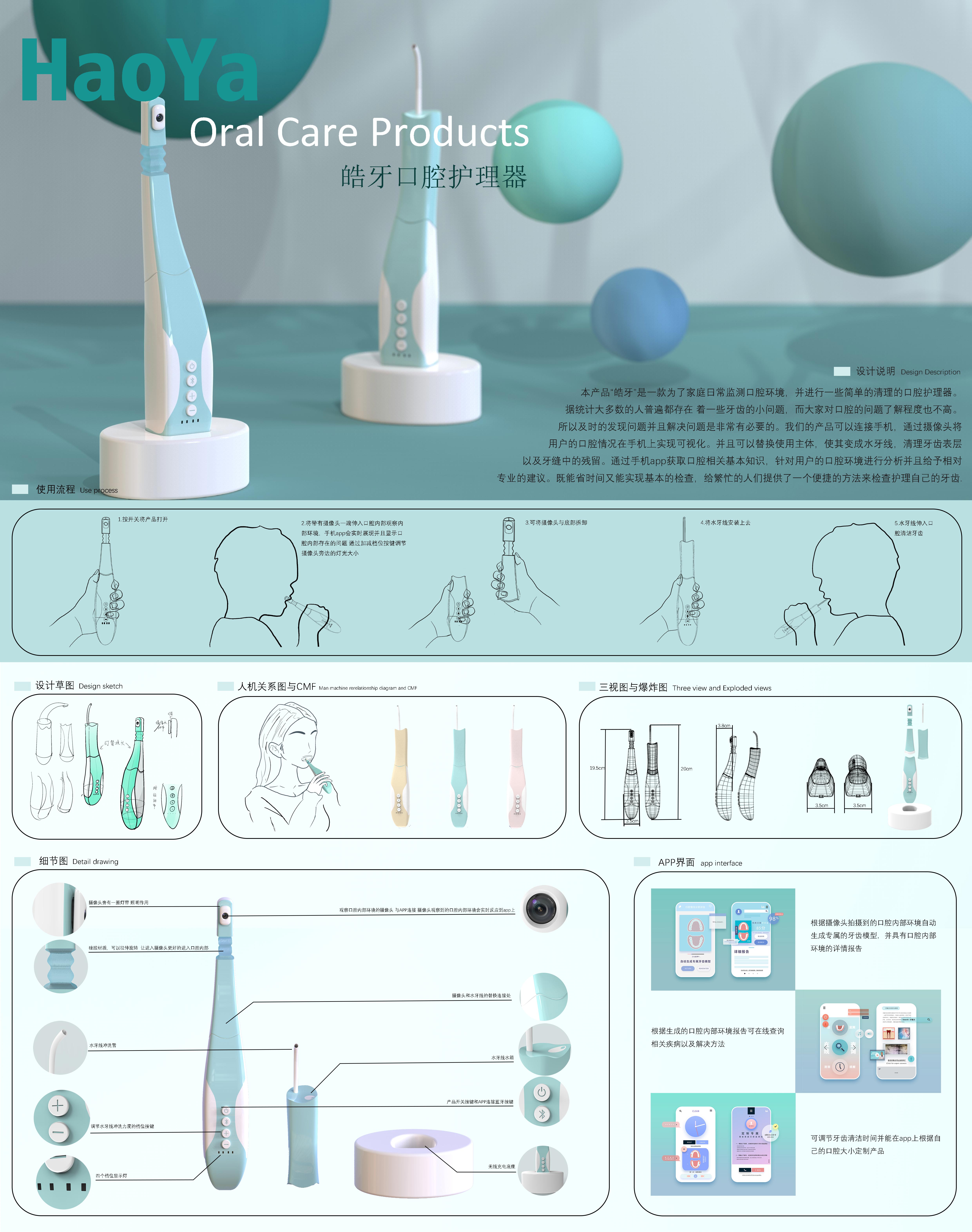 本产品“皓牙”是一款为了家庭日常监测口腔环境,并进行一些简单的清理的口腔护理器。据统计大多数的人普遍都存在 着一些牙齿的小问题,而大家对口腔的问题了解程度也不高。我们的产品可以连接手机,通过摄像头将用户的口腔情况在手机上实现可视化。并且可以替换使用主体,使其变成水牙线,清理牙齿表层以及牙缝中的残留。通过手机app获取口腔相关基本知识,针对用户的口腔环境进行分析并且给予相对专业的建议。