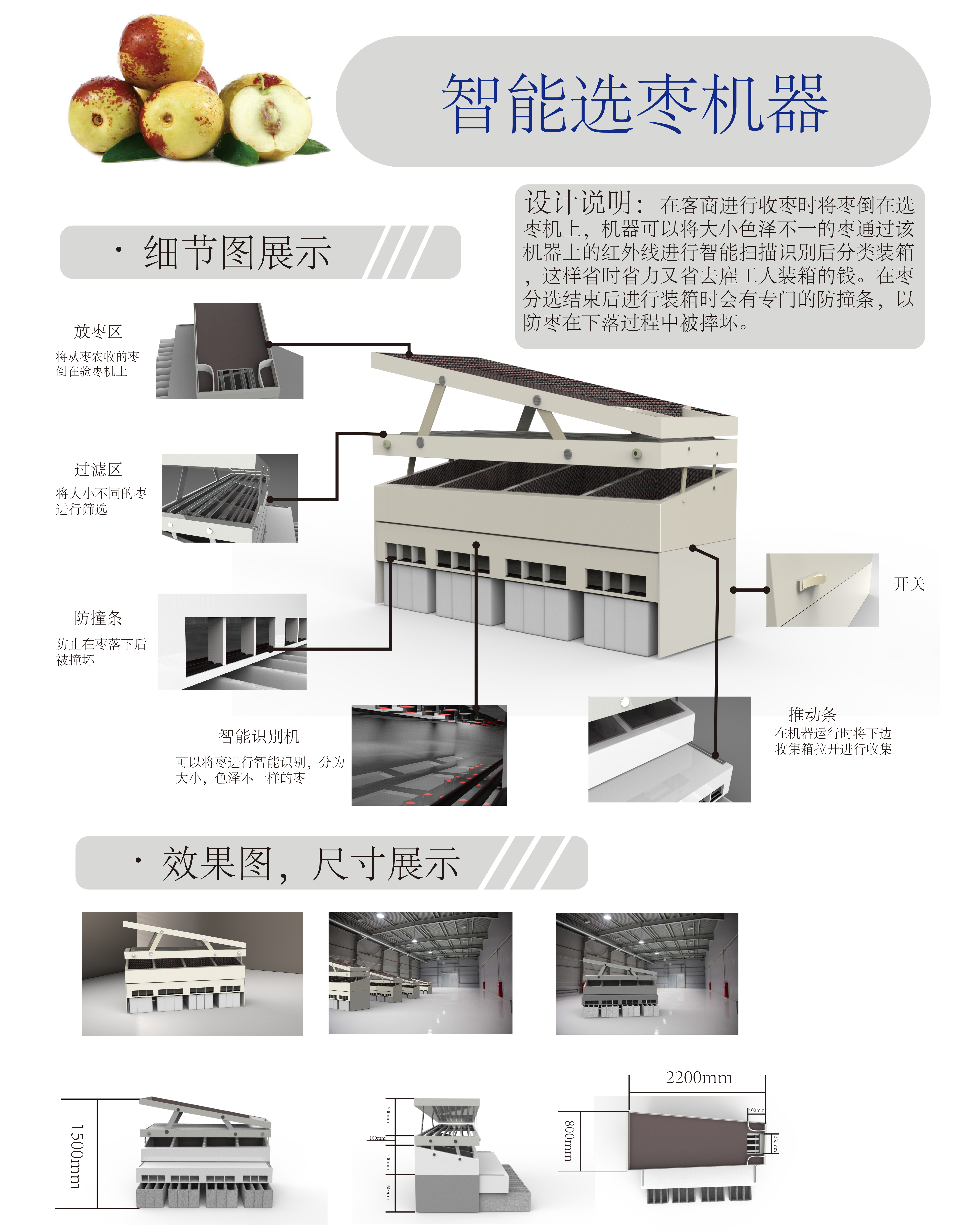 在客商进行收枣时将枣倒在选枣机上,机器可以将大小色泽不一的枣通过该机器上的红外线进行智能扫描识别后分类装箱,这样省时省力又省去雇工人装箱的钱。在枣分选结束后进行装箱时会有专门的防撞条,以防枣在下落过程中被摔坏。