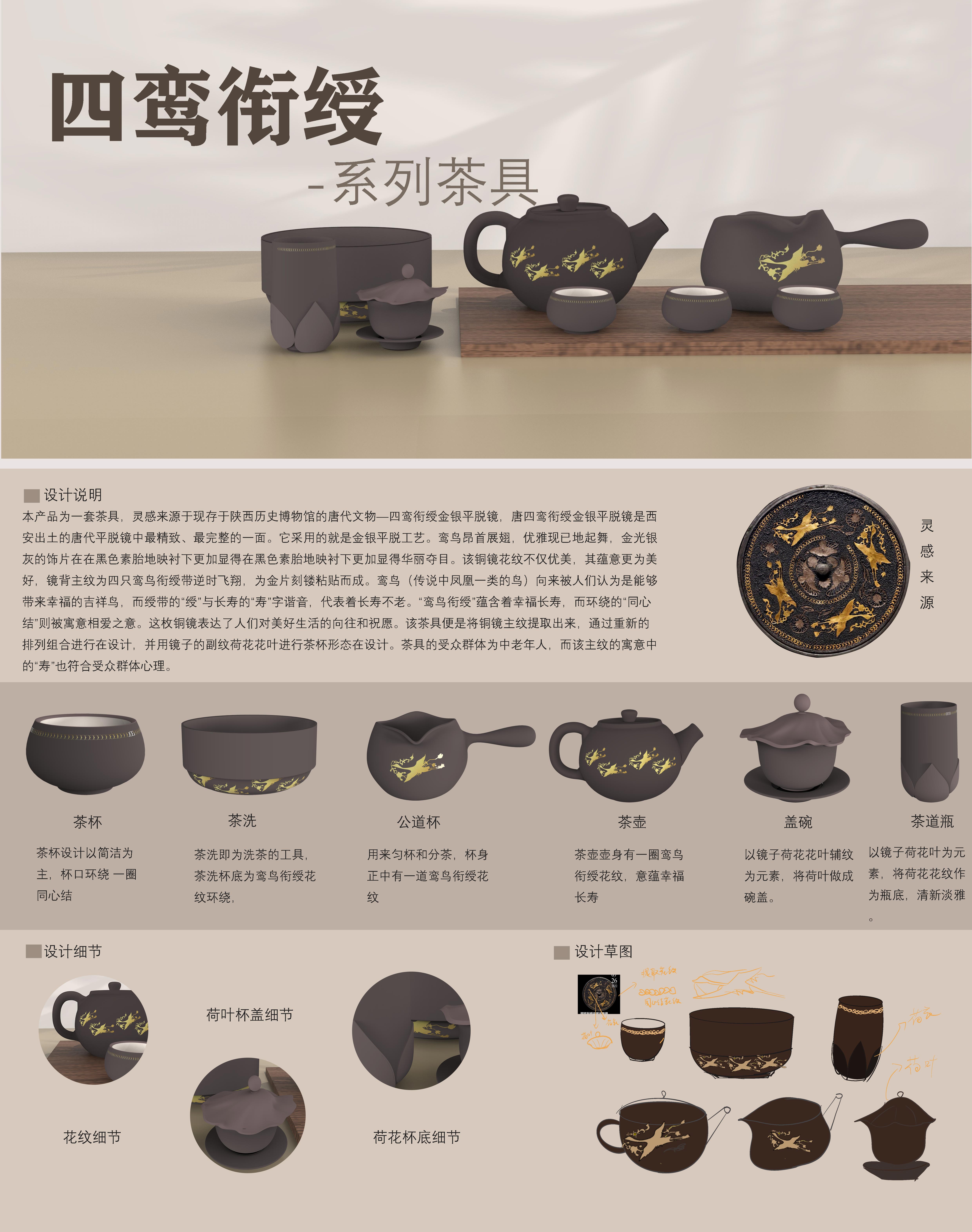 产品为一套茶具,灵感来源于现存于陕西历史博物馆的唐代文物—四鸾衔绶金银平脱镜,镜背主纹为四只鸾鸟衔绶带逆时飞翔,为金片刻镂粘贴而成。鸾鸟向来被人们认为是能够带来幸福的吉祥鸟,而绶带的“绶”与长寿的“寿”字谐音,代表着长寿不老。该茶具便是将铜镜主纹提取出来,通过重新的排列组合进行在设计,并用镜子的副纹荷花花叶进行茶杯形态在设计。茶具的受众群体为中老年人,而该主纹的寓意中的“寿”也符合受众群体心理。