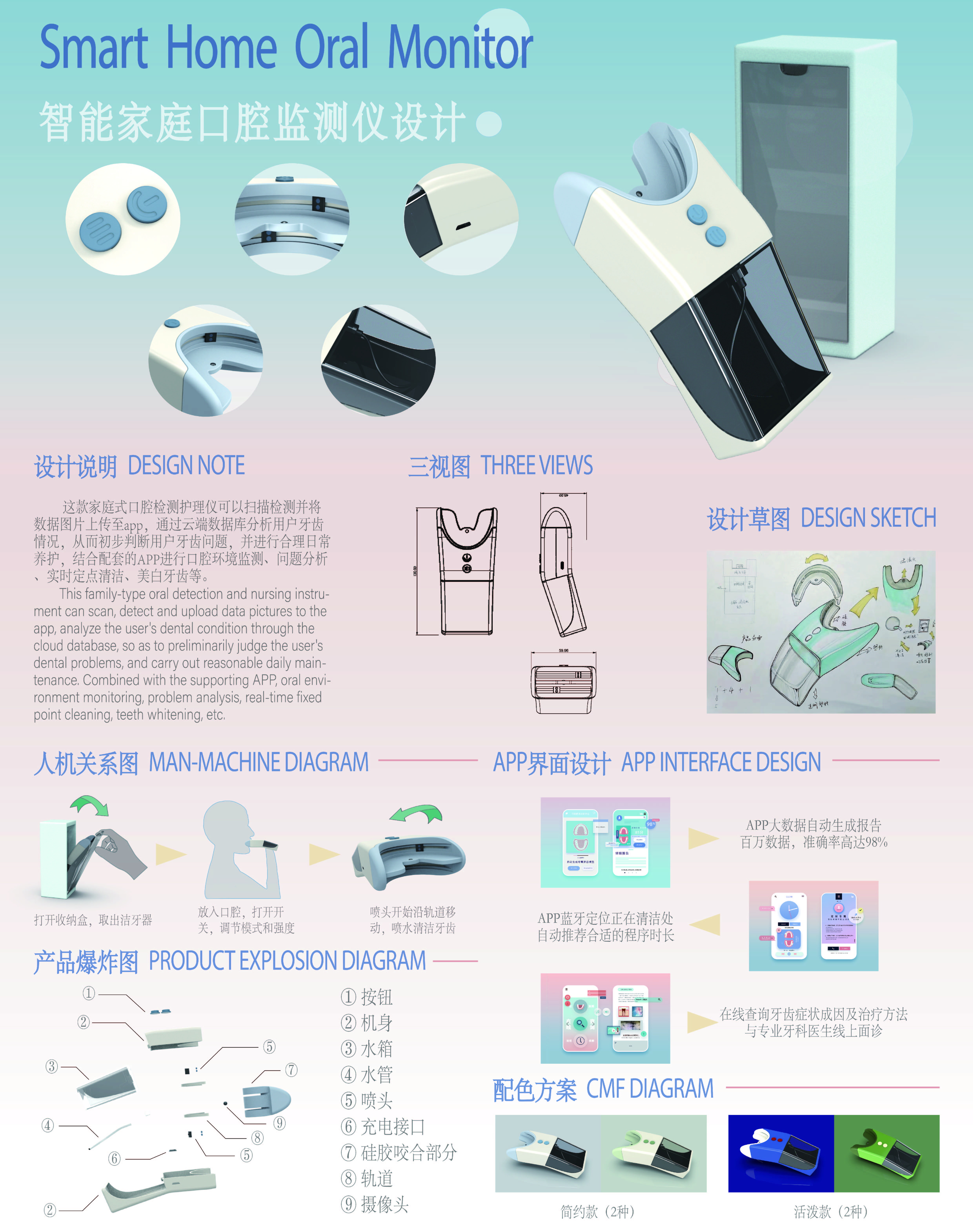 这款家庭式口腔检测护理仪可以扫描检测并将数据图片上传至app,通过云端数据库分析用户牙齿情况,从而初步判断用户牙齿问题,并进行合理日常养护,结合配套的APP进行口腔环境监测、问题分析、实时定点清洁、美白牙齿等。