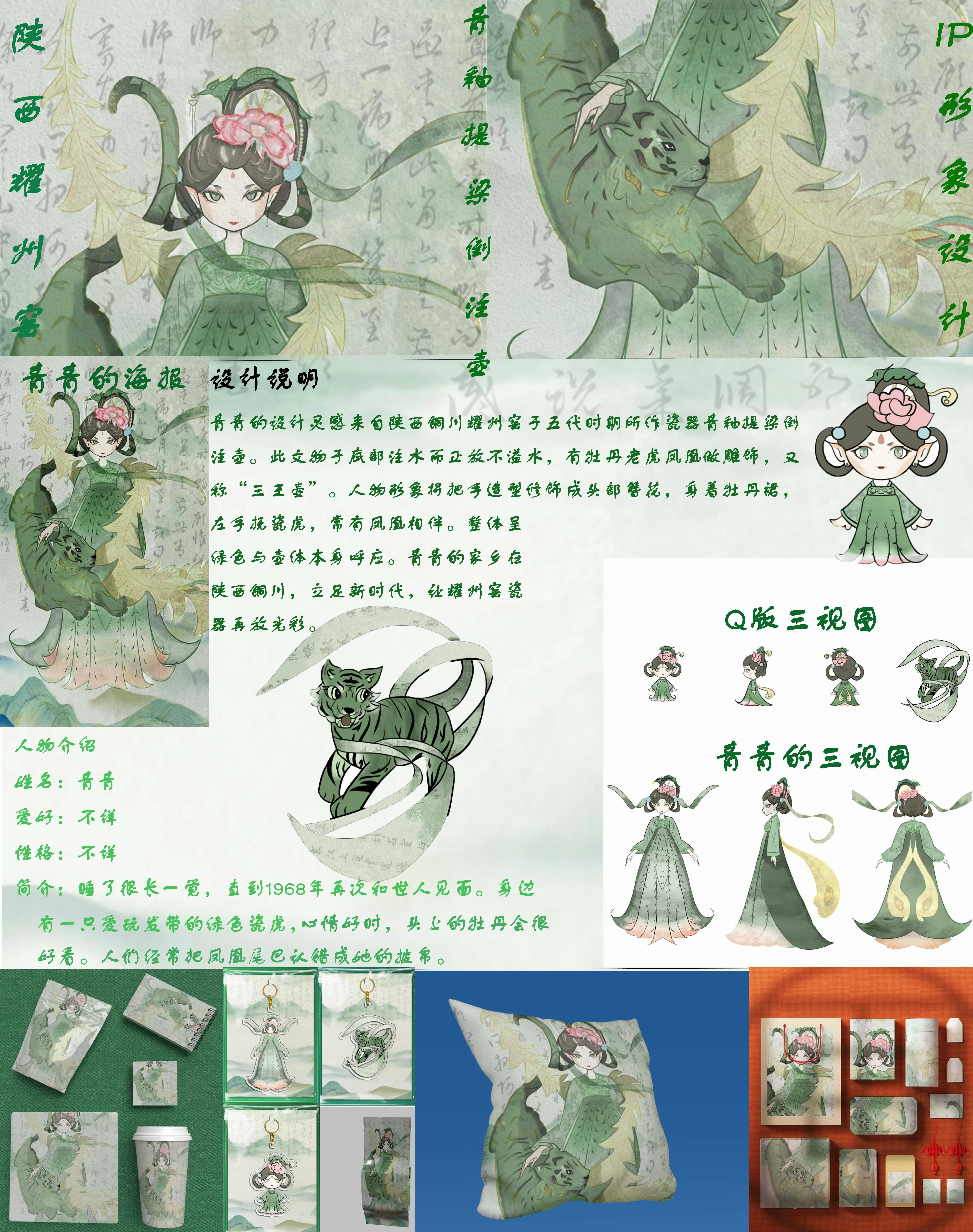 俗话说“南有龙泉窑,北有耀州窑”。 青青的设计灵感就来自陕西铜川耀州窑于五代时期所作瓷器青釉提梁倒注壶。此文物于底部注水而正放不溢,有牡丹老虎凤凰做雕饰,又 称“三王壶”。人物形象将把手造型修饰成头部簪花,身着牡丹裙,左手抚瓷虎,常有凤凰相伴。整体呈绿色与壶体本身呼应。 青青的家乡在陕西铜川,立足新时代,让陕西省铜川市耀州窑瓷器再放光彩。