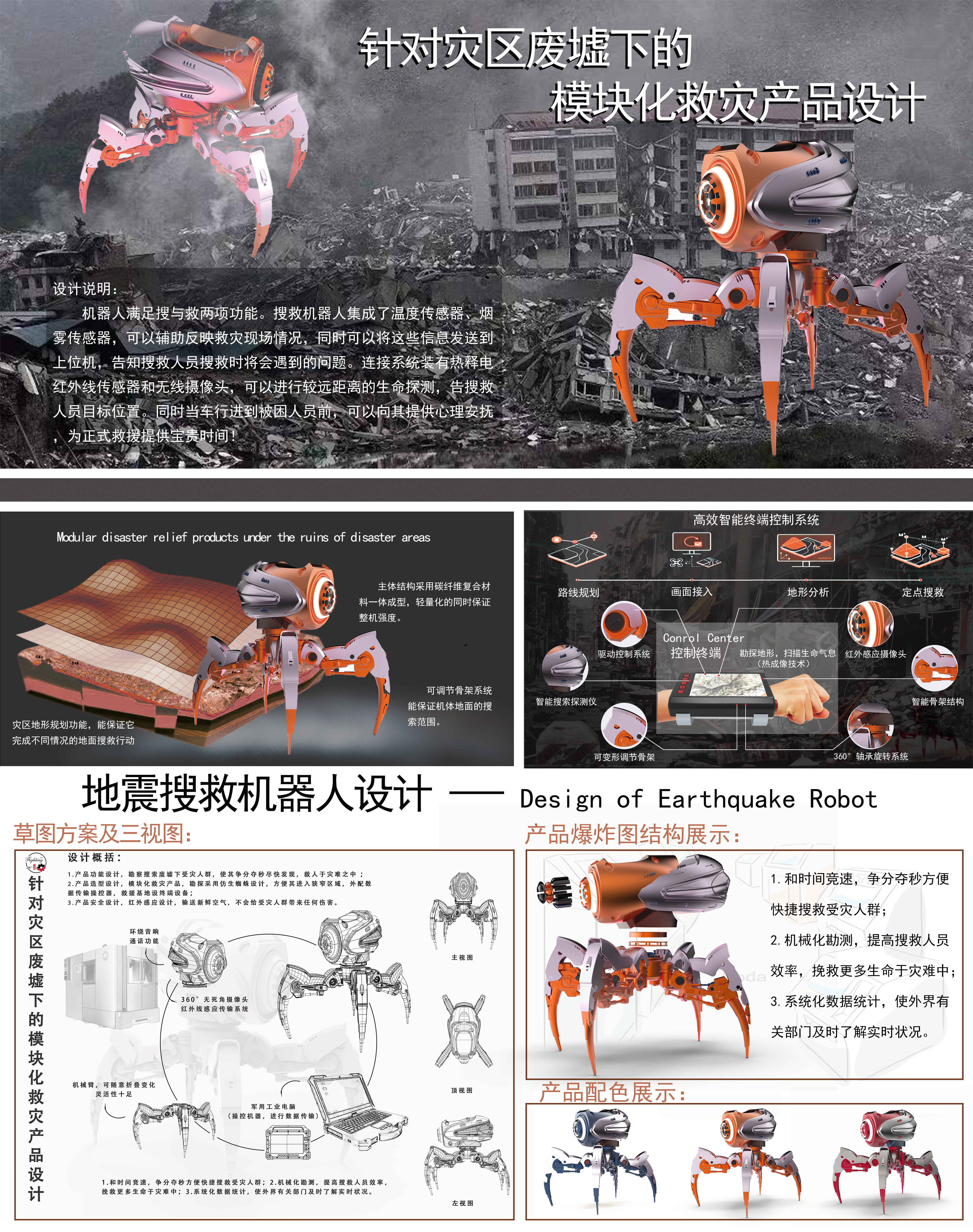 机器人满足搜与救两项功能。搜救机器人集成了温度传感器、烟雾传感器,可以辅助反映救灾现场情况,同时可以将这些信息发送到上位机,告知搜救人员搜救时将遇到的问题。连接系统装有热释电红外线传感器和无线摄像头可以进行较远距离的生命探测,告搜救人员目标位置。同时当车行进到被困人员前,可以向其提供心理安抚,为正式救援提供宝贵时间!勘探采用仿生蜘蛛设计方便其进入狭窄区域,外配数据传输操控器救援基地设终端设备。