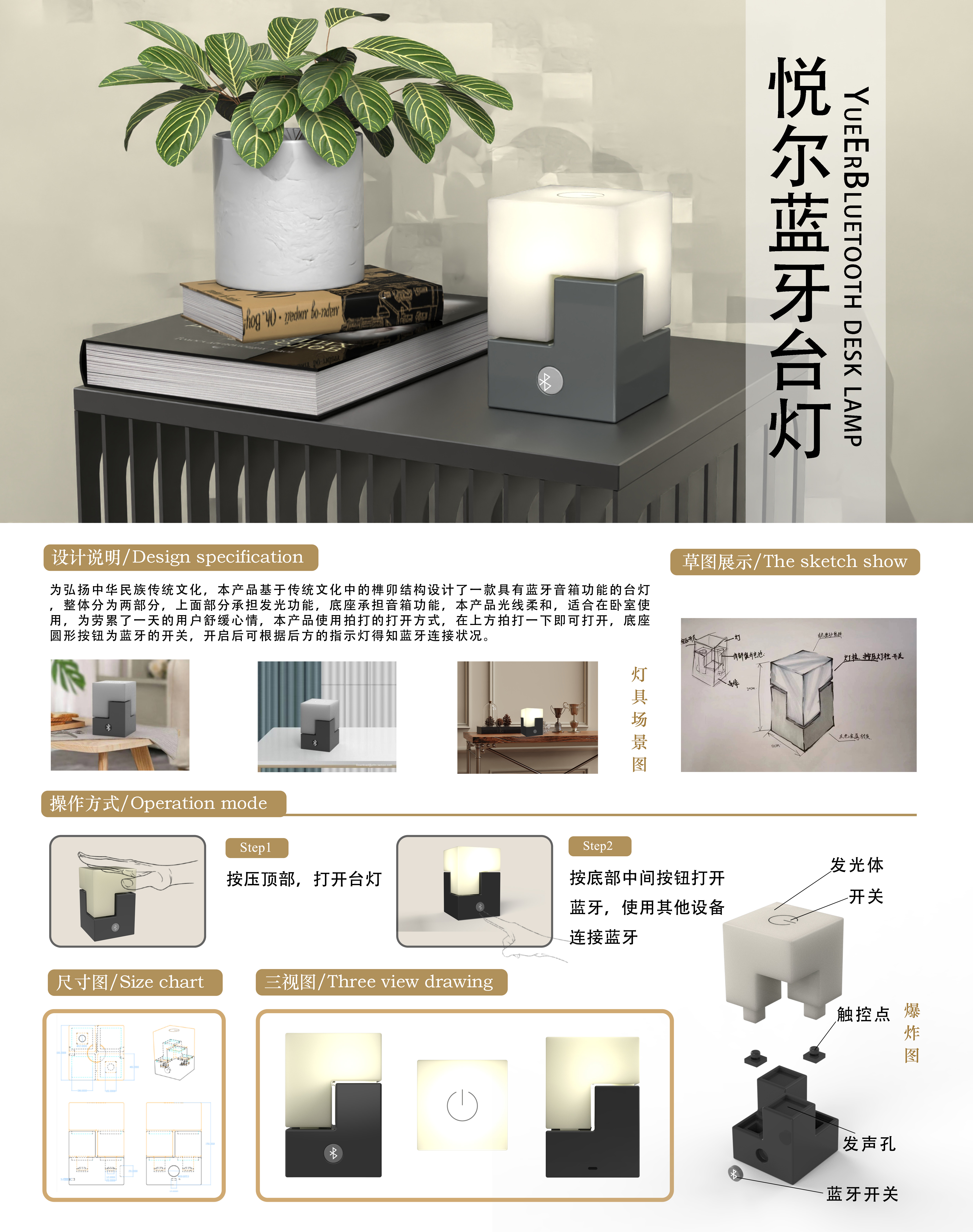 为弘扬中华民族传统文化,本产品基于传统文化中的榫卯结构设计了一款具有蓝牙音箱功能的台灯,整体分为两部分,上面部分承担发光功能,底座承担音箱功能,本产品光线柔和,适合在卧室使用,为劳累了一天的用户舒缓心情,本产品使用拍打的打开方式,在上方拍打一下即可打开,底座圆形按钮为蓝牙的开关,开启后可根据后方的指示灯得知蓝牙连接状况。