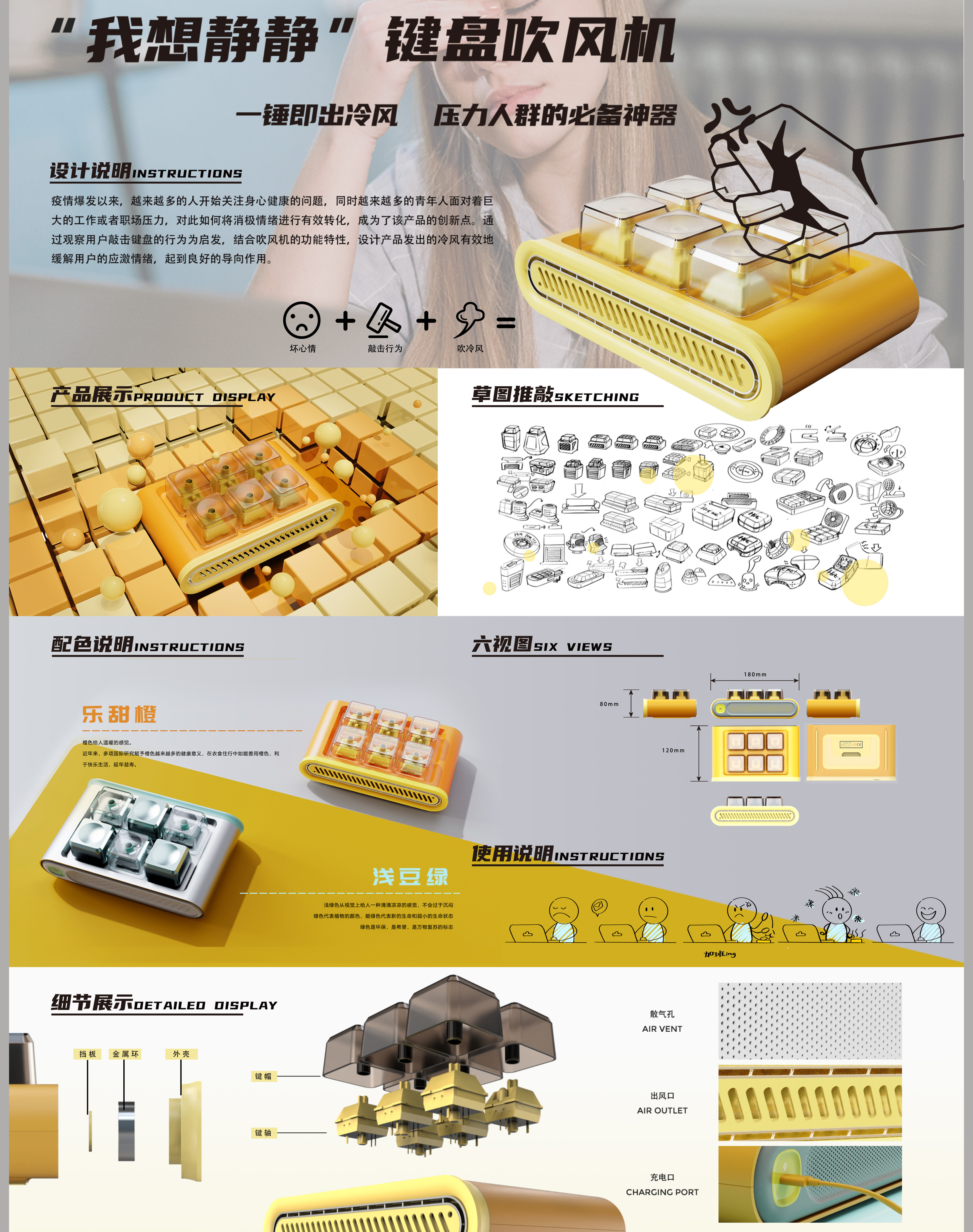 疫情爆发以来,越来越多的人开始关注身心健康的问题,同时越来越多的青年人面对着巨大的工作或者职场压力,对此如何将消极情绪进行有效转化,成为了该产品的创新点。通过观察用户敲击键盘的行为为启发,结合吹风机的功能特性,设计产品发出的冷风有效地缓解用户的应激情绪,起到良好的导向作用