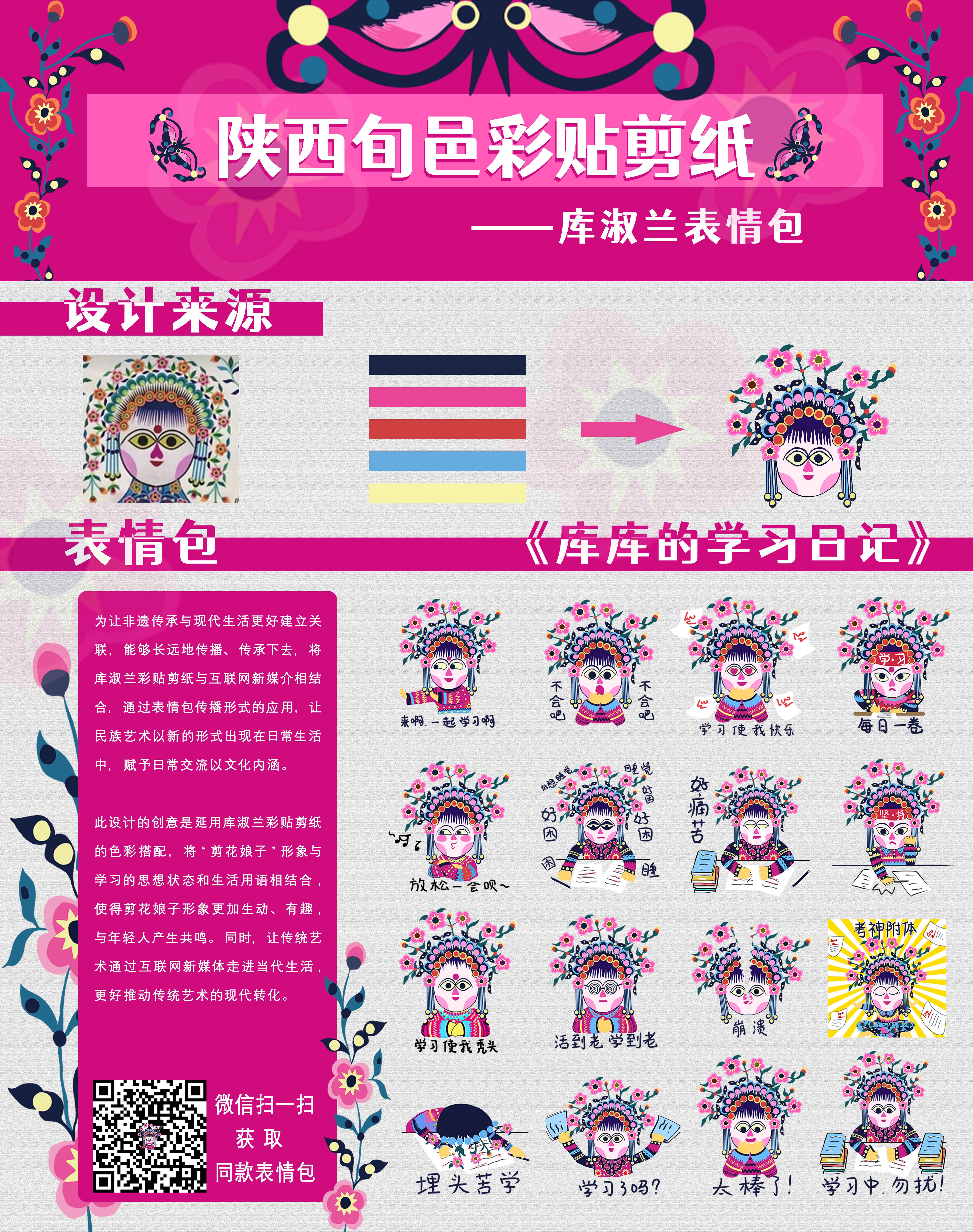 此设计的创意是将库淑兰彩贴剪纸与互联网新媒介相结合,通过表情包传播形式的应用,让民族艺术以新的形式出现在日常生活中,赋予日常交流以文化内涵。 此设计延用库淑兰彩贴剪纸的色彩搭配,将“剪花娘子”形象与学习的思想状态和生活用语相结合,使得剪花娘子形象更加生动、有趣,与年轻人产生共鸣。同时,让传统艺术通过互联网新媒体走进当代生活,更好推动传统艺术的现代转化。