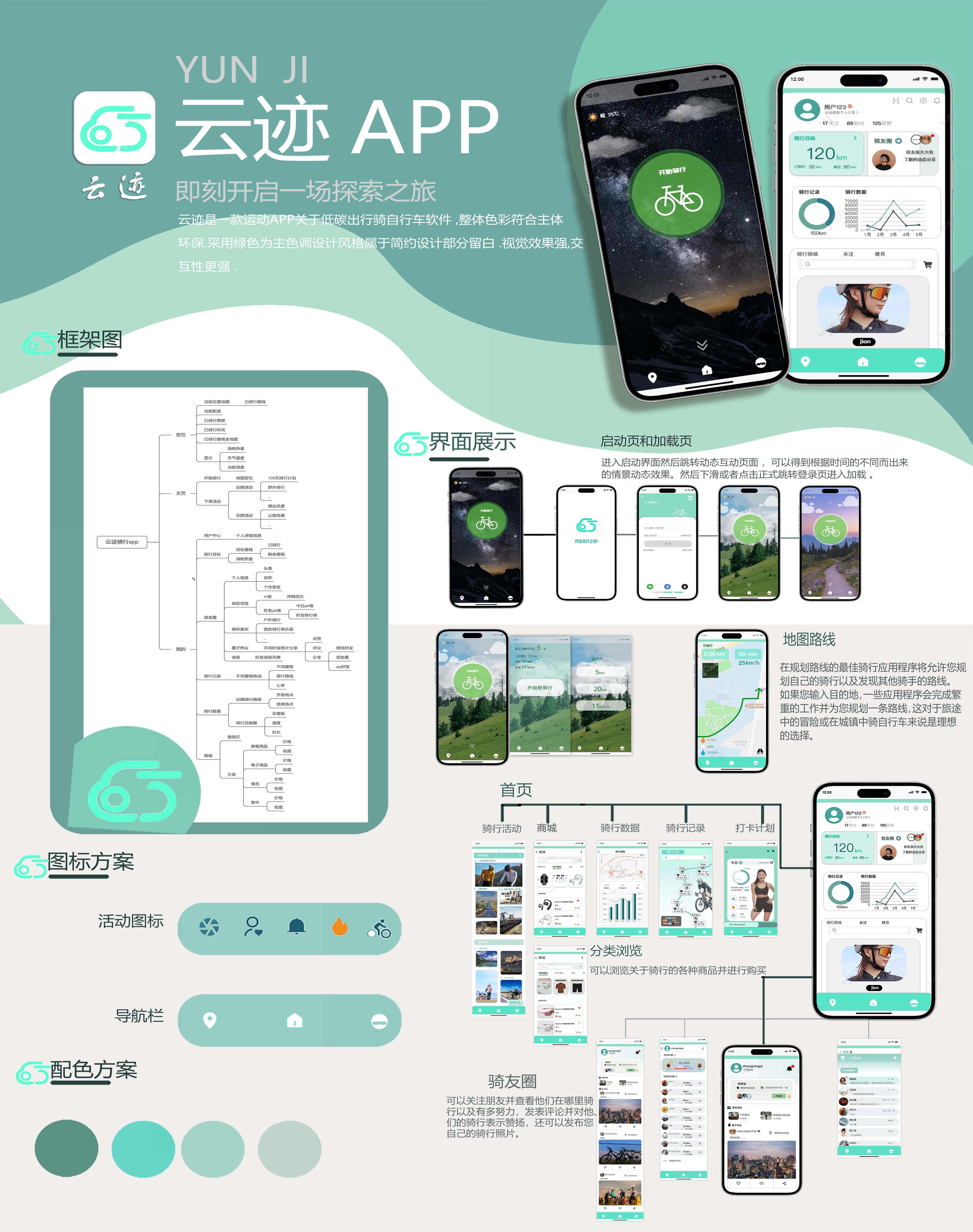 云迹是一款运动APP关于低碳出行骑自行车软件,整体色彩符合主体环保。采用绿色为主色调设计风格属于简约设计部分留白,视觉效果强,交互性更强。