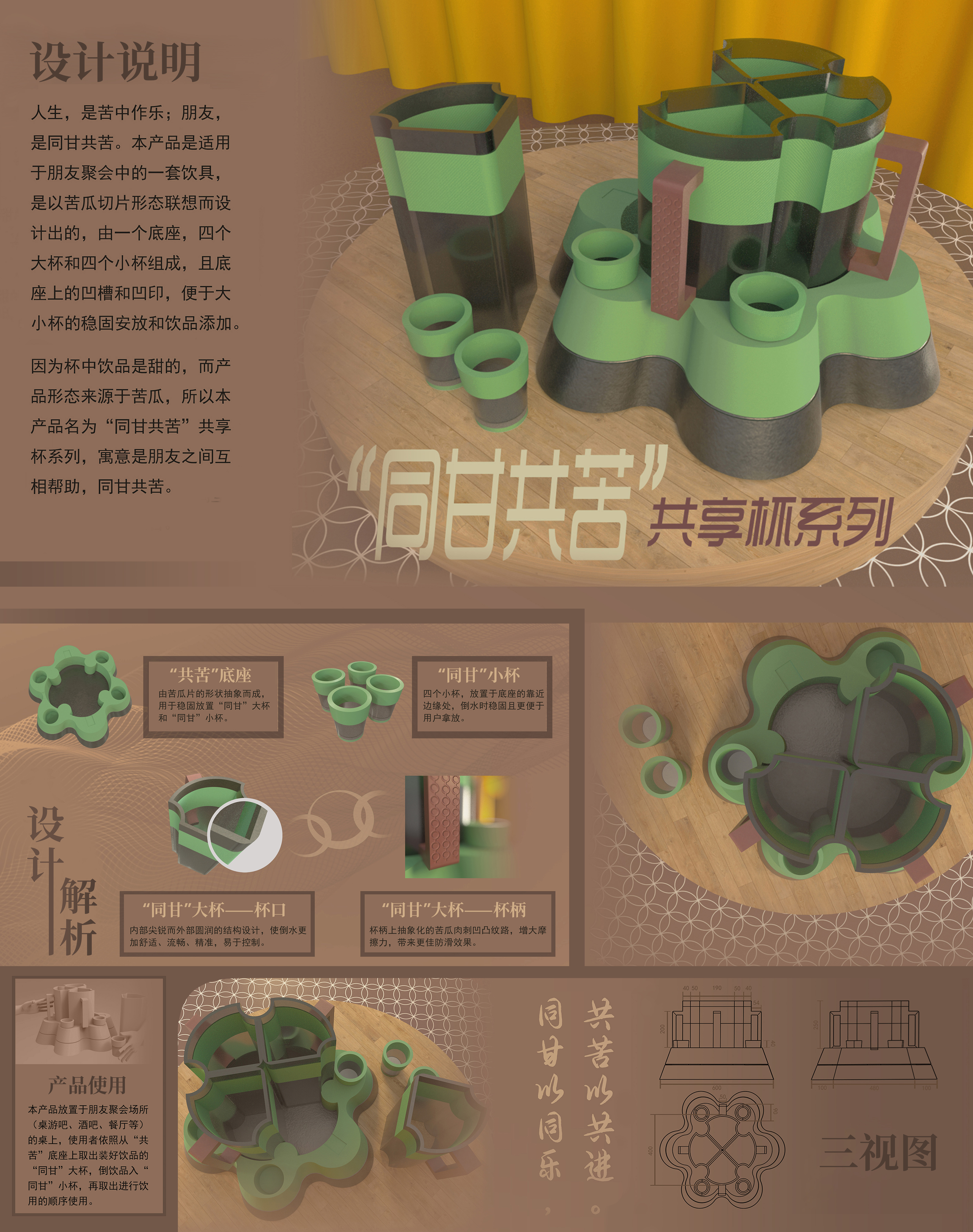 人生,是苦中作乐;朋友,是同甘共苦。本产品是适用于朋友聚会中的一套饮具,是以苦瓜切片形态联想而设计出的,由一个底座,四个大杯和四个小杯组成,且底座上的凹槽和凹印,便于大杯和小杯的稳固安放和饮品添加。因为杯中饮品是甜的,而产品形态来源于苦瓜,所以本产品名为“同甘共苦”共享杯系列,寓意是朋友之间互相帮助,同甘共苦。