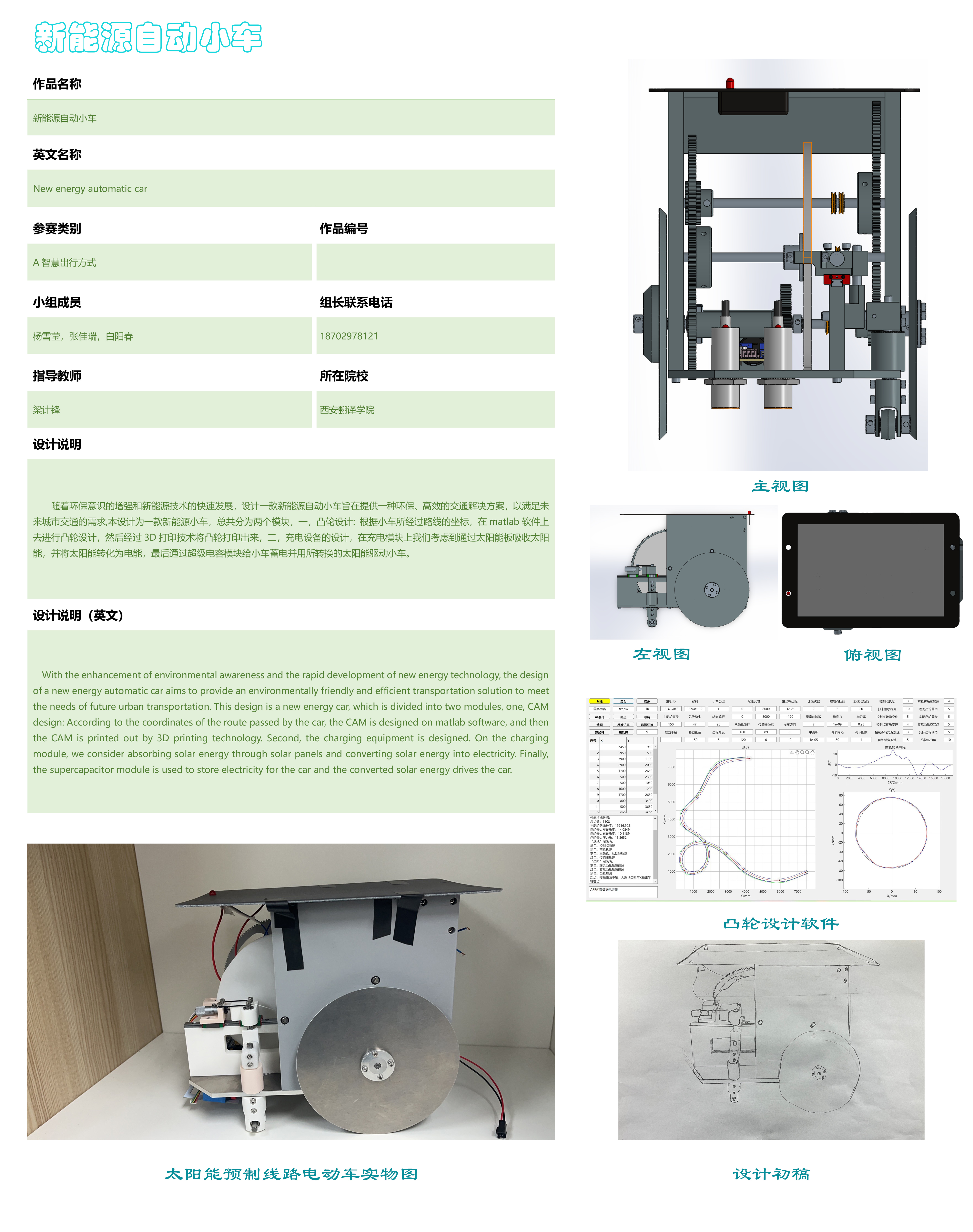 随着环保意识的增强和新能源技术的快速发展,设计一款新能源自动小车旨在提供一种环保、高效的交通解决方案,以满足未来城市交通的需求。我们团队采用可再生能源如太阳能充电系统,这样可以提升能源利用效率。在车体设计上我们采用轻量化材料,以减轻整车重量,提升能源利用效率,优化空气动力学设计,降低风阻,提高续航里程。并且我们还添加了语音播报模块,可以准确识别文字。