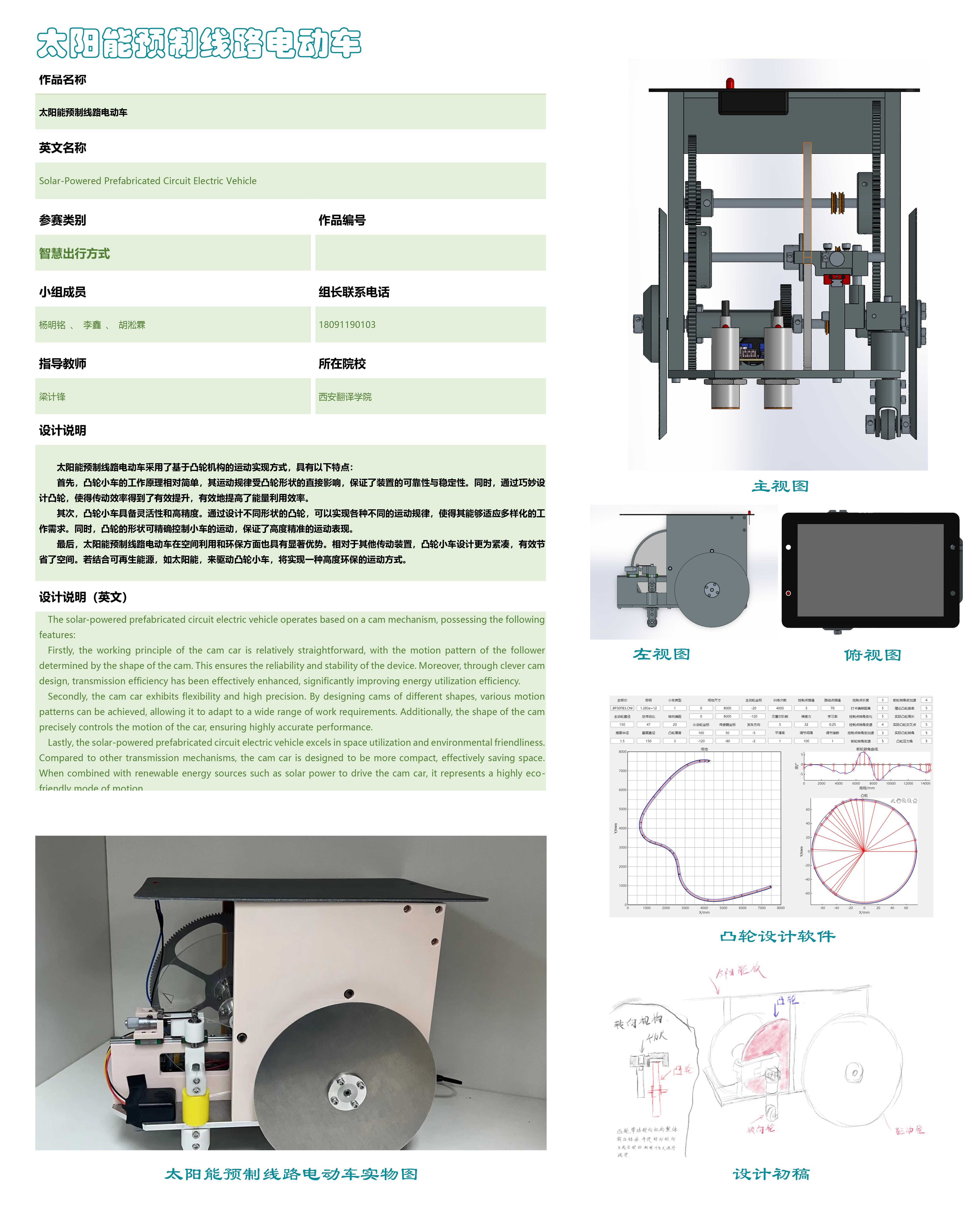 太阳能预制线路电动车采用基于凸轮机构的运动方式,具有以下特点:凸轮小车工作简单,其运动受凸轮形状直接影响,确保了装置可靠稳定。通过巧妙设计凸轮,传动效率得到有效提升,提高了能量利用效率。凸轮小车灵活且高精度,可设计不同凸轮形状实现多样化路线,适应不同工作需求。凸轮形状精确控制小车运动,太阳能预制线路电动车在空间利用和环保方面具有显著优势,设计更紧凑,结合可再生能源如太阳能驱动,实现高度环保运动方式