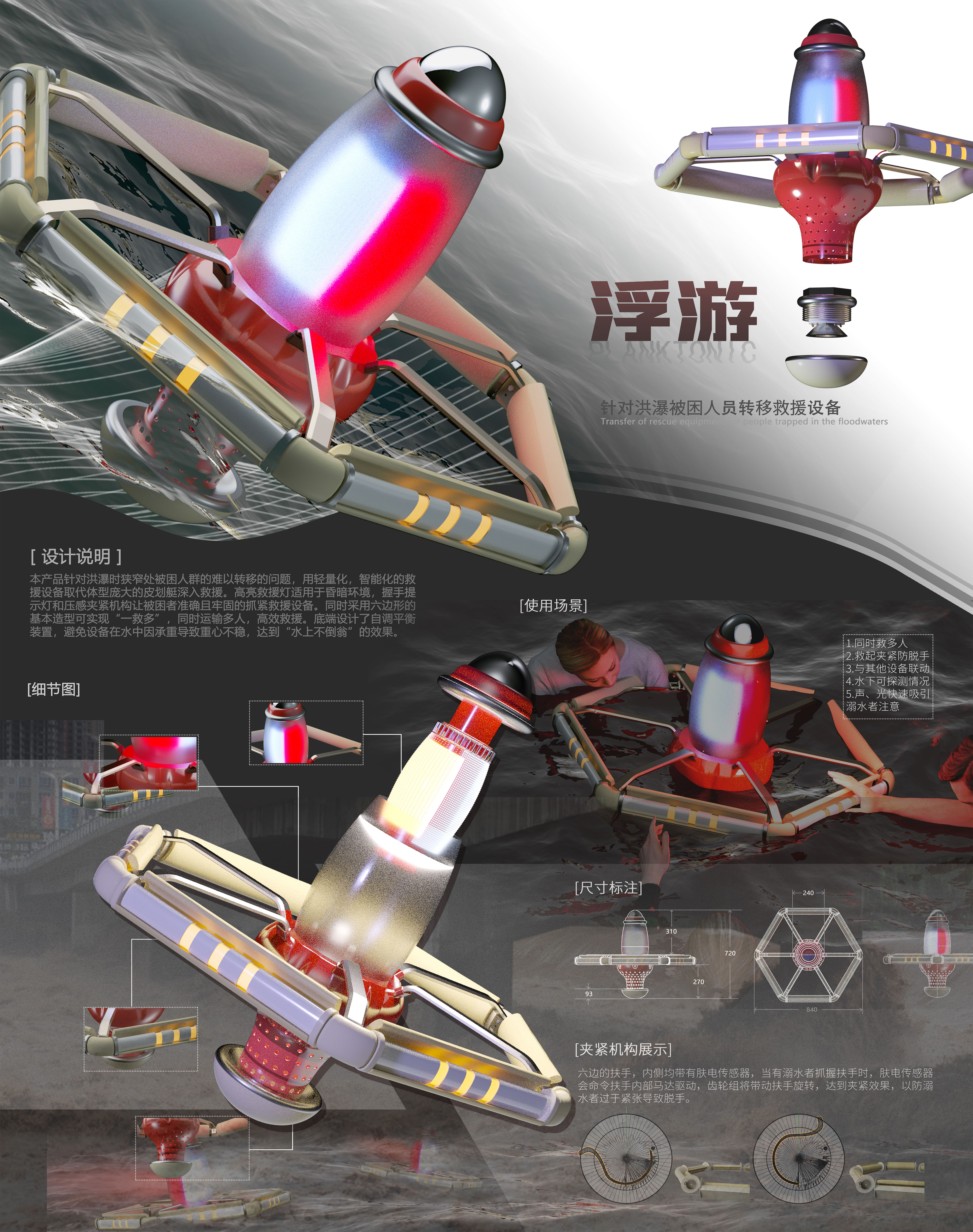本产品针对洪瀑时狭窄处被困人群的难以转移的问题,用轻量化,智能化的救援设备取代体型庞大的皮划艇深入救援。高亮救援灯适用于昏暗环境,握手提示灯和压感夹紧机构让被困者准确且牢固的抓紧救援设备。同时采用六边形的基本造型可实现“一救多”,同时运输多人,高效救援。底端设计了自调平衡装置,避免设备在水中因承重导致重心不稳,达到“水上不倒翁”的效果。