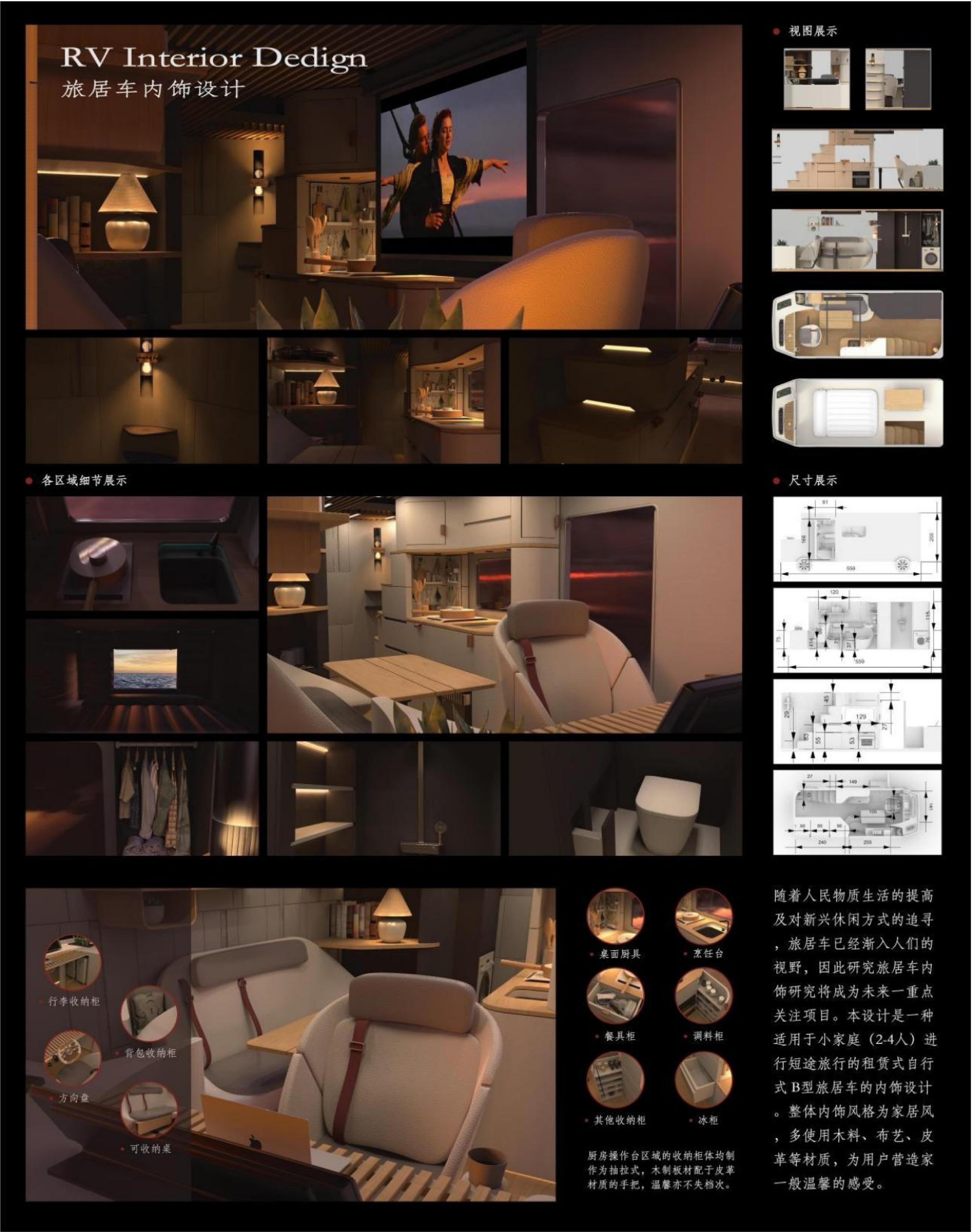 随着人民物质生活的提高及对新兴休闲方式的追寻,旅居车已经渐入人们的视野,因此研究旅居车内饰研究将成为未来一重点关注项目。本设计是一种适用于小家庭(2-4人)进行短途旅行的自行式B型旅居车的内饰设计。整体内饰风格为家居风,多使用木料、布艺、皮革等材质,为用户营造家一般温馨的感受。