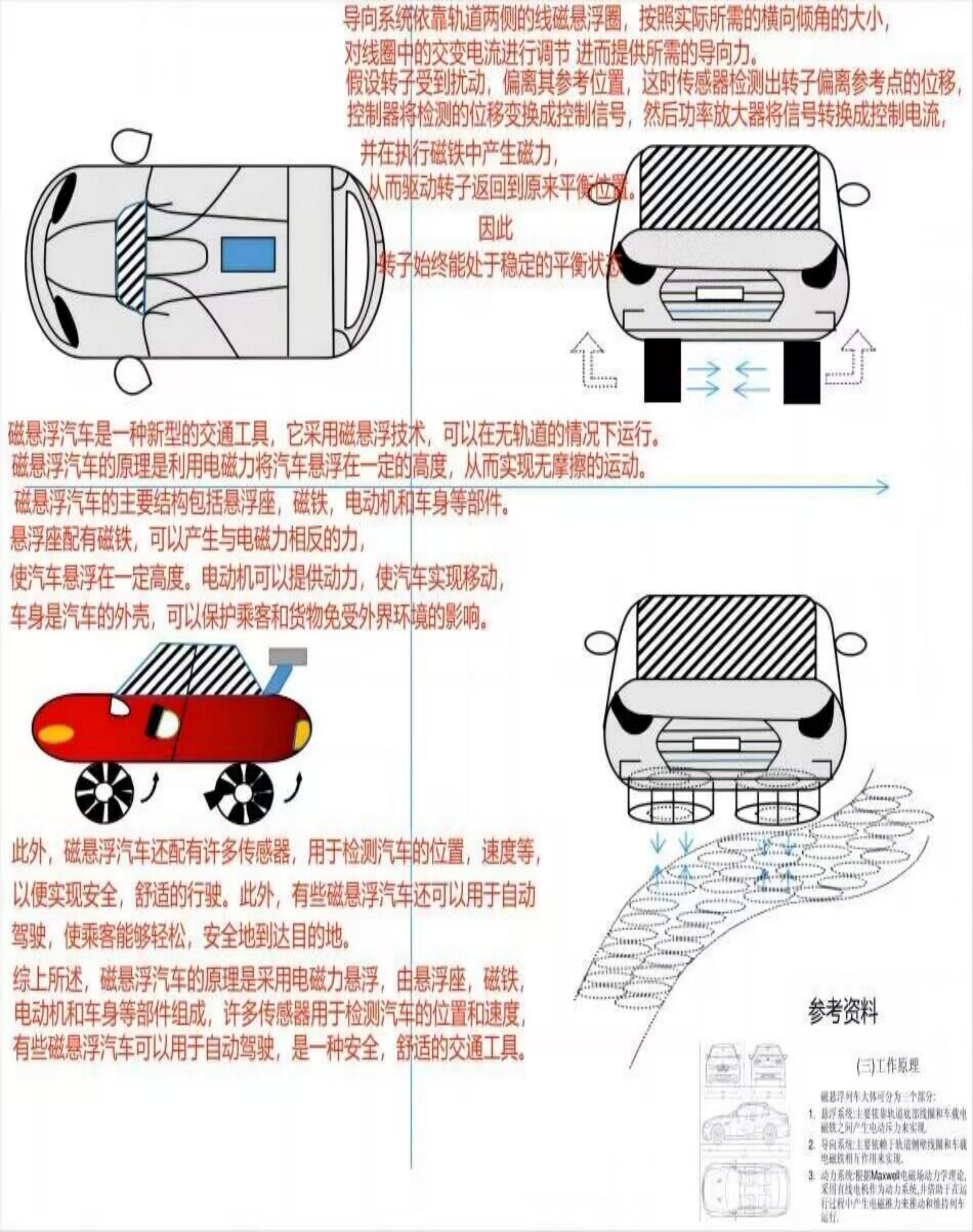 磁悬浮汽车是在车轮中间安装一个旋转发动机,在车轮外侧为磁铁构成。在普通的道路上,磁悬浮汽车会和正常的汽车一样正常行驶,因为它的两轮毂之间的力对其转动并无任何影响。而在磁悬浮汽车专用车道上,轮胎会随着车主按下车内的按键而翻转与地面平行并固定,接着车轮的转动会改变路面铝板上的磁场,产生感应电流。轮子的N极被车道上靠前的S极吸引,同时被车道上靠后的N极排斥,相互作用产生浮力和驱动力,在一拉一推之间前进。