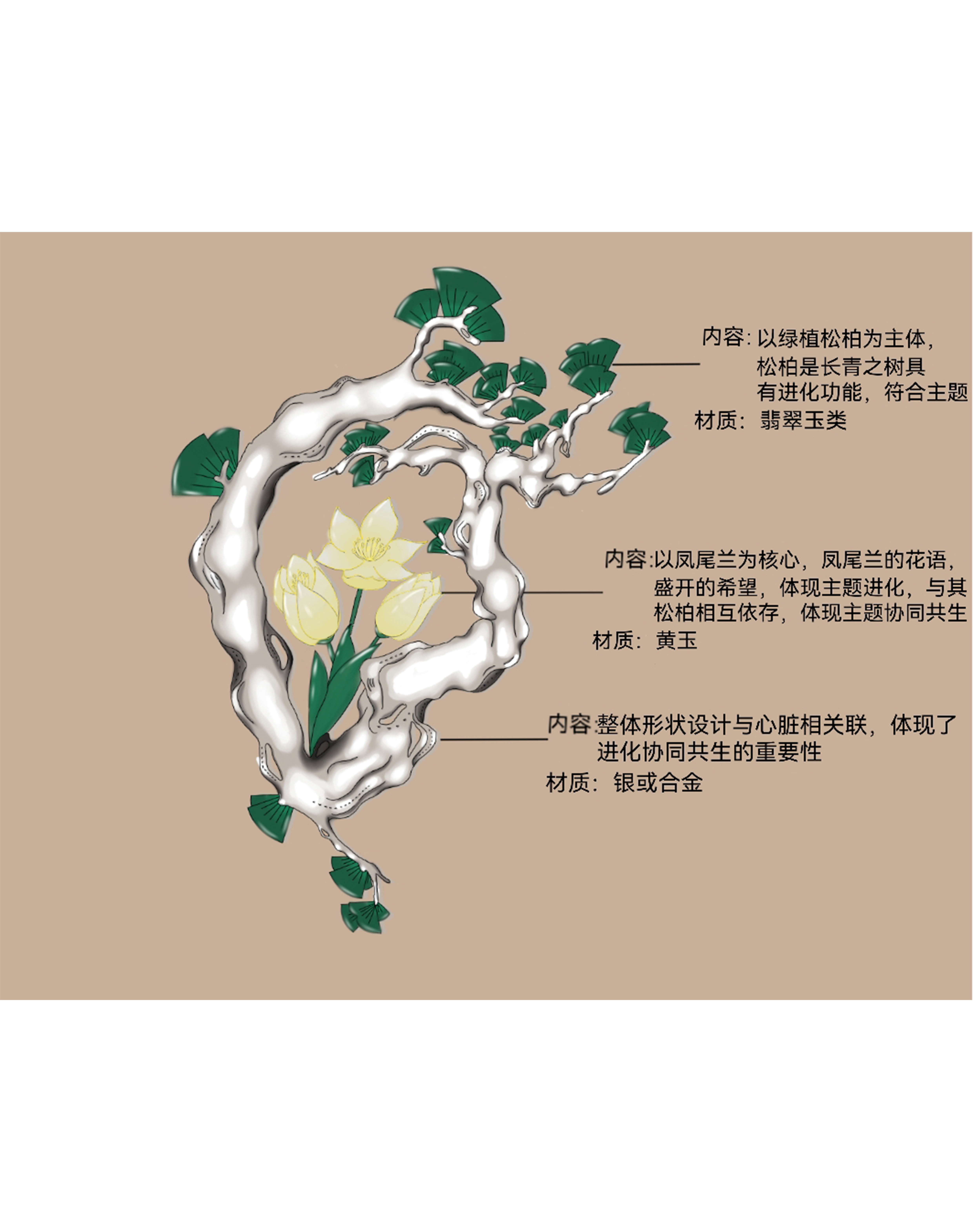 常青之兰以智能穿戴设备为主体,创作出一款美观且轻便的智能检测设备。整个胸针的设计假想都紧扣进化•协同•共生的理念,松柏—常青之树的进化理念、松柏与凤尾兰紧密相连,相互依存的协同理念,而松柏呈现的心脏型正是共生理念。
