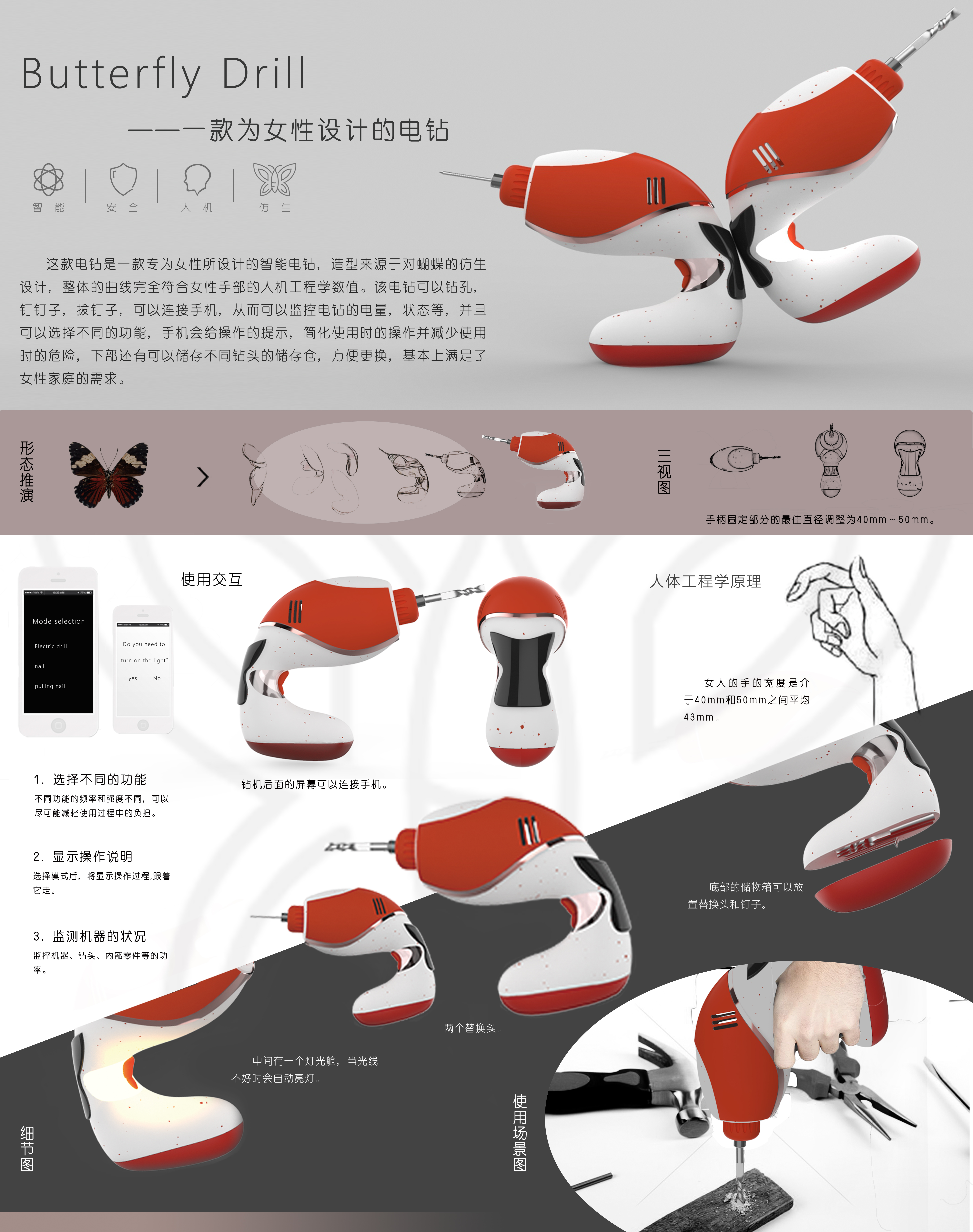 这款电钻是一款专为女性所设计的智能电钻,造型来源于对蝴蝶的仿生设计,整体的曲线完全符合女性手部的人机工程学数值。该电钻可以钻孔,钉钉子,拔钉子,可以连接手机,从而可以监控电钻的电量,状态等,并且可以选择不同的功能,手机会给操作的提示,简化使用时的操作并减少使用时的危险,下部还有可以储存不同钻头的储存仓,方便更换,基本上满足了女性家庭的需求。