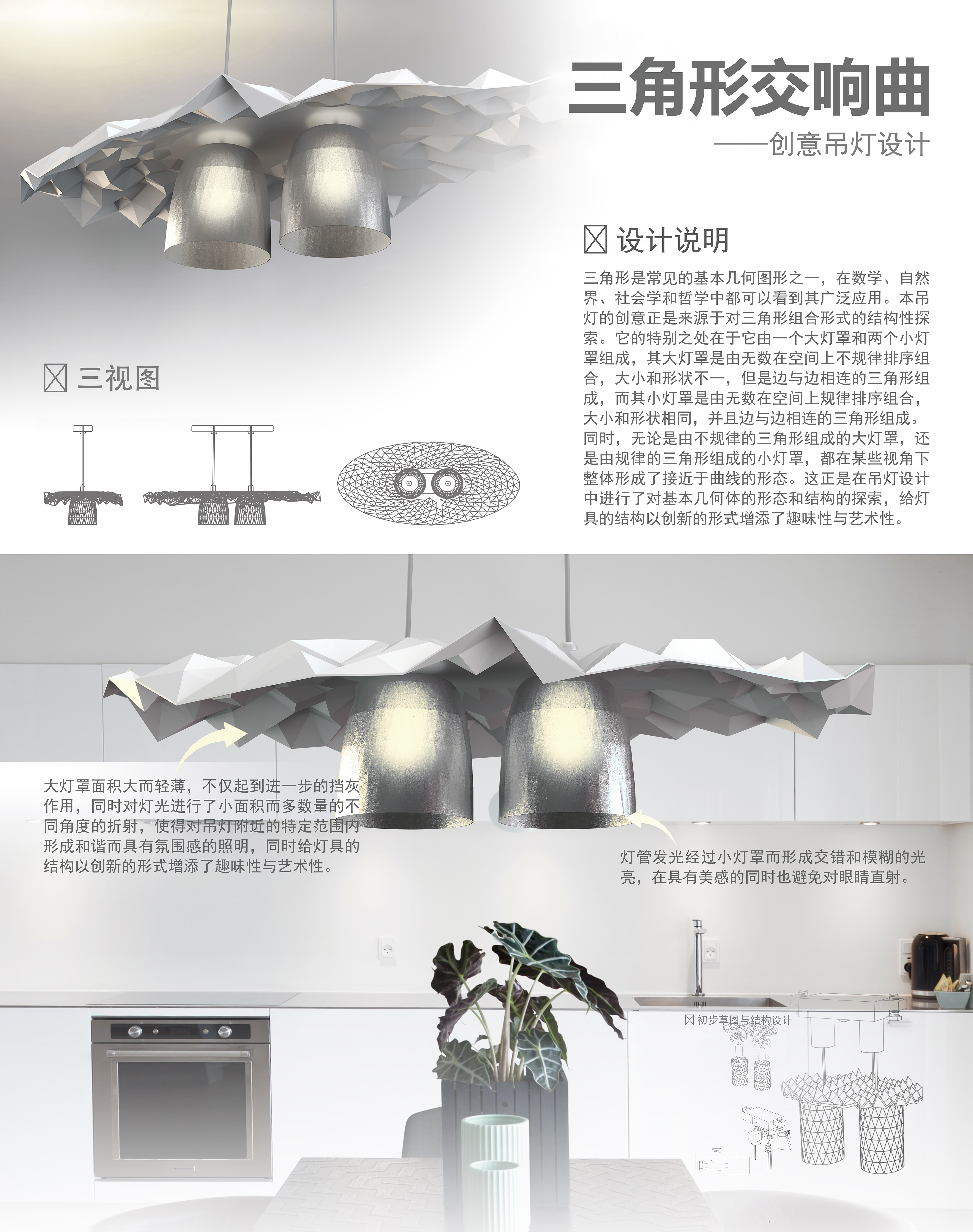 本吊灯的创意正是来源于对三角形组合形式的结构性探索。特别之处在于它由一个大灯罩和两个小灯罩组成,其大灯罩是由无数在空间上不规律排序组合,大小和形状不一,但是边与边相连的三角形组成,而其小灯罩是由无数在空间上规律排序组合,大小和形状相同,并且边与边相连的三角形组成。这正是在吊灯设计中进行了对基本几何体的形态和结构的探索,给灯具的结构以创新的形式增添了趣味性与艺术性。