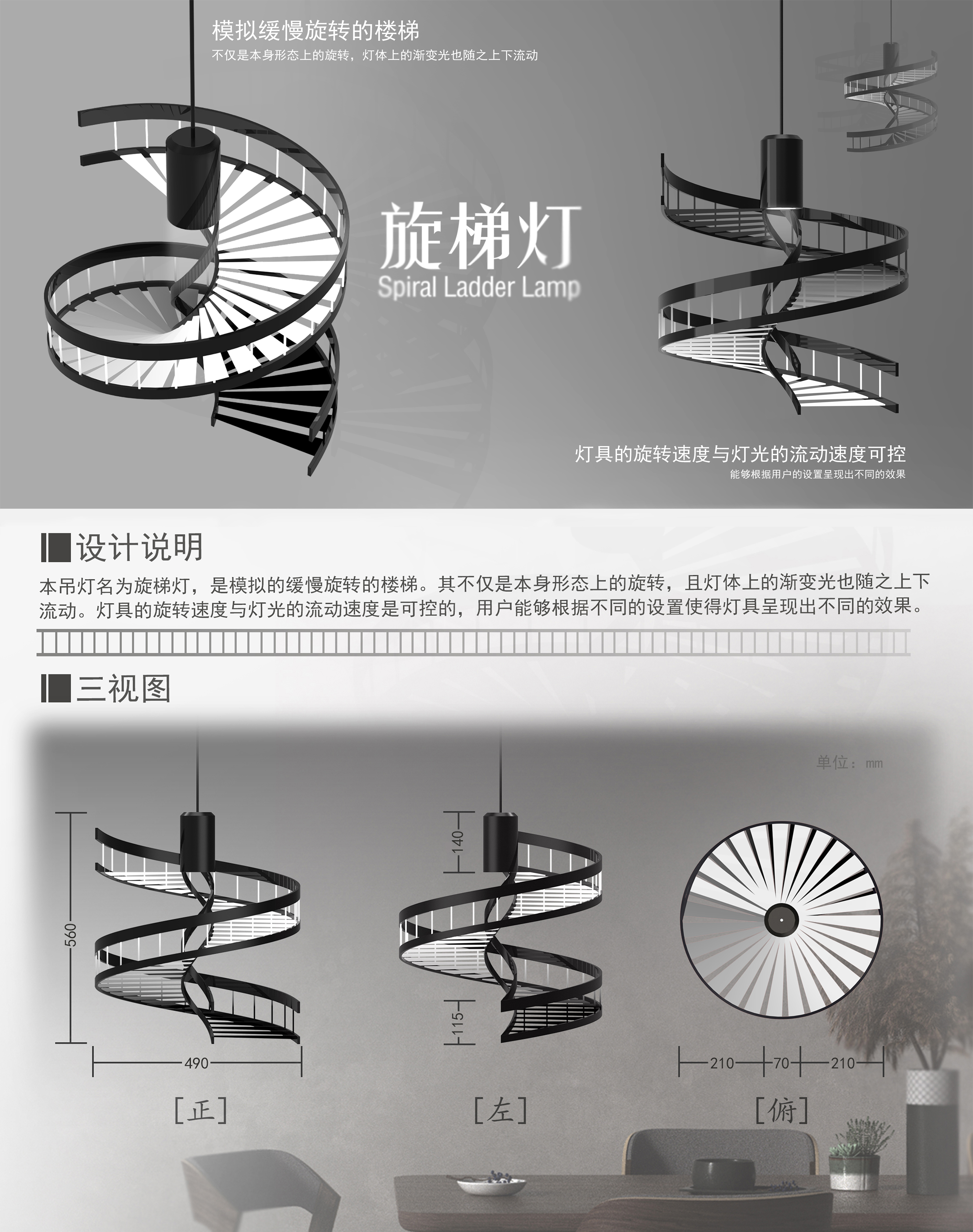 本吊灯名为旋梯灯,是模拟的缓慢旋转的楼梯。其不仅是本身形态上的旋转,且灯体上的渐变光也随之上下流动。灯具的旋转速度与灯光的流动速度是可控的,用户能够根据不同的设置使得灯具呈现出不同的效果。