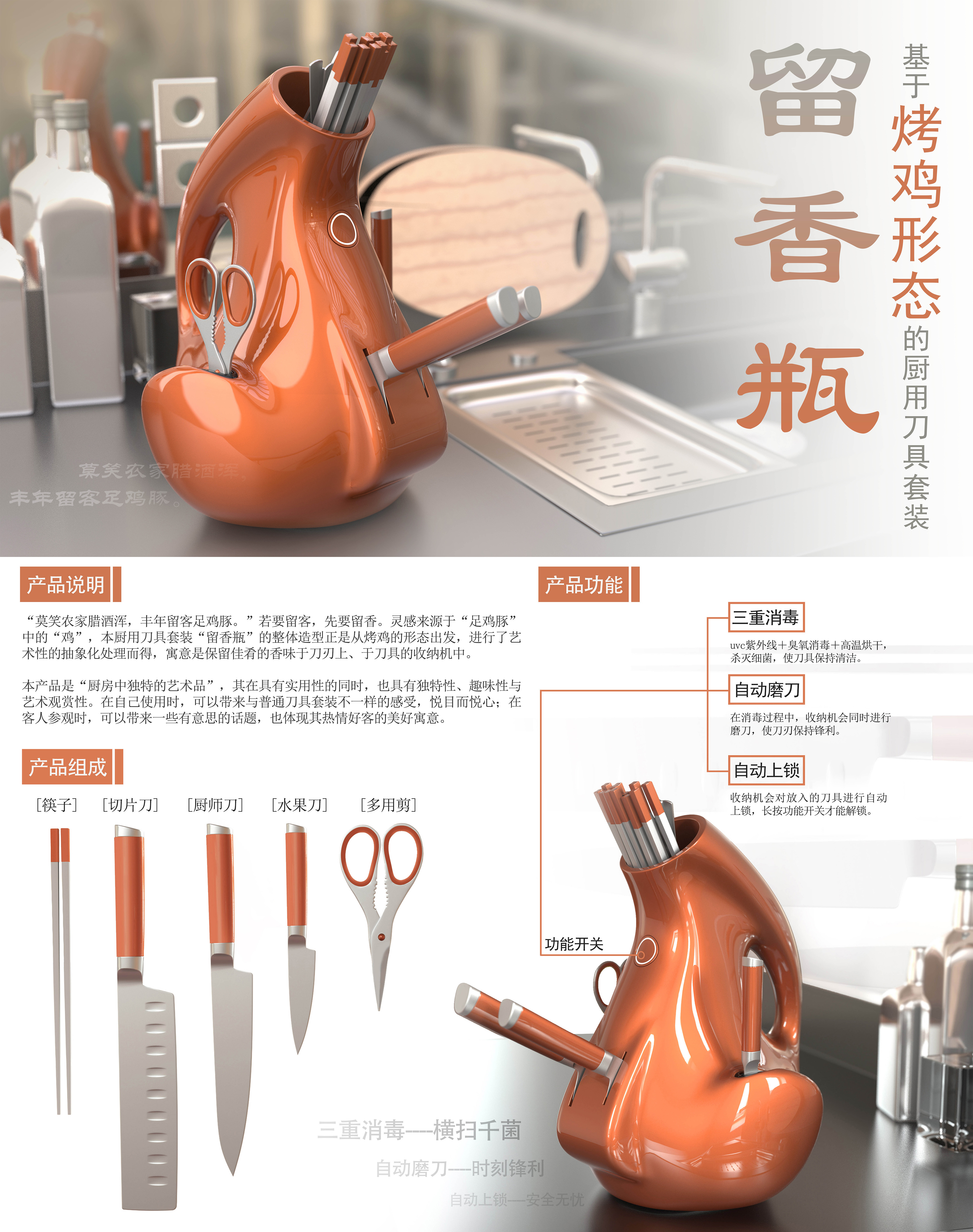 “莫笑农家腊酒浑,丰年留客足鸡豚。”若要留客,先要留香。灵感来源于“足鸡豚”中的“鸡”,本厨用刀具套装“留香瓶”的整体造型是从烤鸡的形态出发,进行艺术性的抽象化处理而得,寓意是保留佳肴的香味于刀刃上、于刀具的收纳机中。本产品是“厨房中独特的艺术品”,在具有实用性的同时也具有独特性。自己使用时可以带来与普通刀具不一样的感受,悦目而悦心;客人参观时可以带来一些有意思的话题,也体现热情好客的美好寓意。
