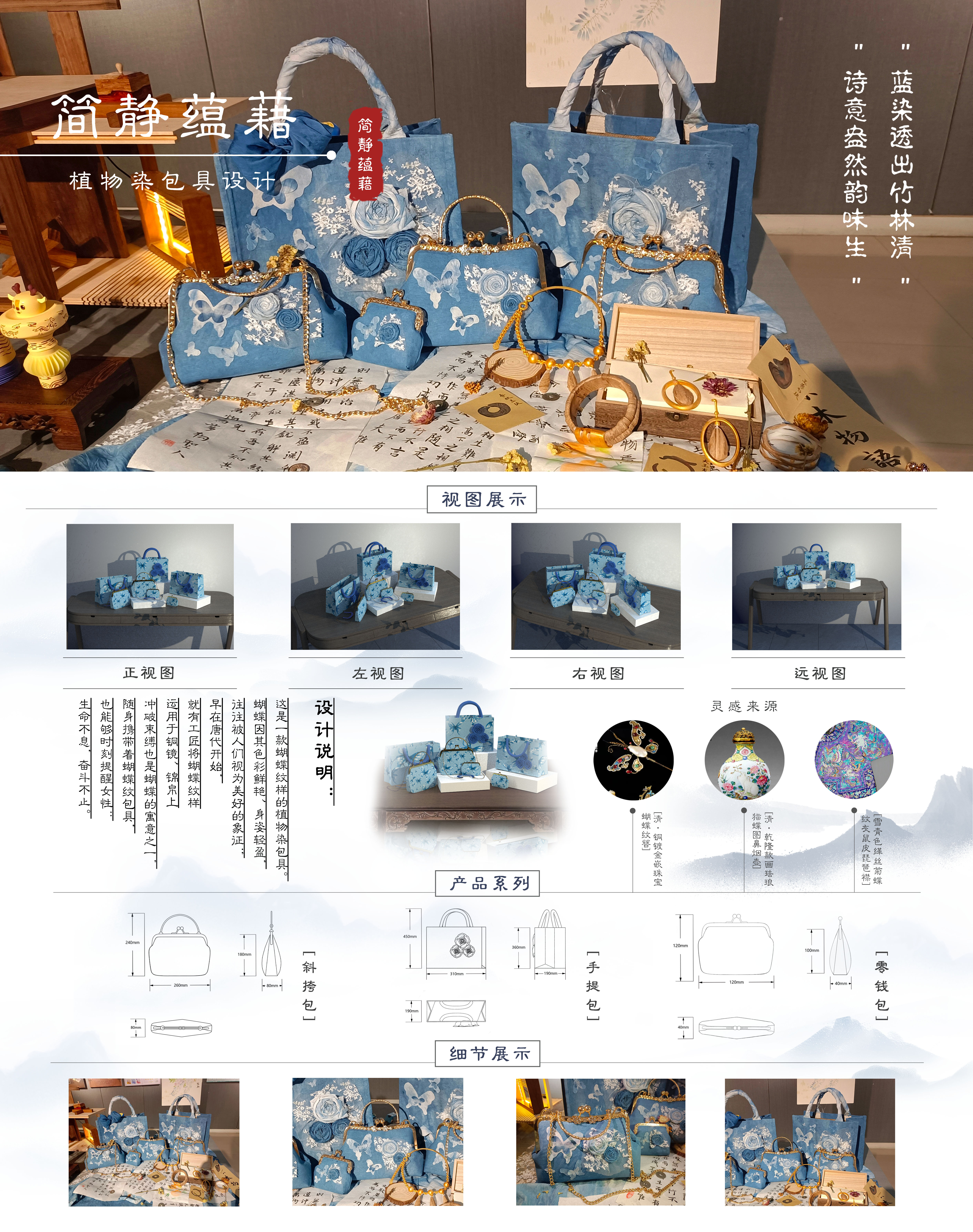 这是一款以中国传统纹样蝴蝶纹为灵感设计的植物染包具,蝴蝶在中国古代是一种十分常见的艺术题材,比如破茧成蝶、梁祝化蝶、庄周梦蝶的故事都和蝴蝶有关。这一系列包具在继承了中国传统纹样蝴蝶纹的审美特征基础上,融入了国家非物质文化遗产之一靛蓝染和扎染的元素,既赋予了主题“简静蕴藉”这种简约沉静、含蓄有余的文化内涵,也提倡了人与自然和谐共生的观念,使其融入现代简洁的审美,又不失东方美学与传统文化的韵味。
