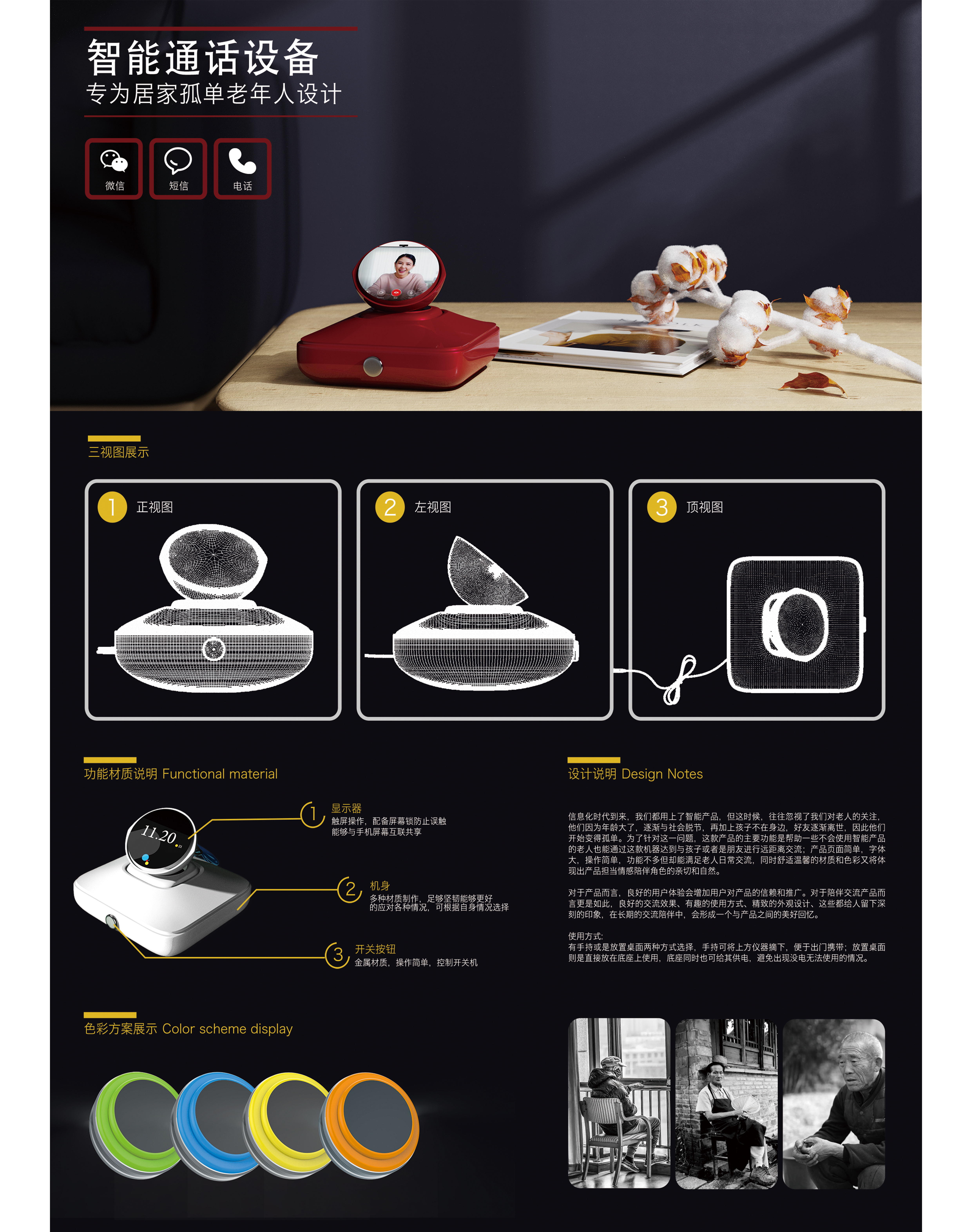 信息化时代到来,我们都用上了智能产品,但这时候,往往忽视了我们对老人的关注,他们因为年龄大了,逐渐与社会脱节,再加上孩子不在身边,好友逐渐离世,因此他们开始变得孤单。为了针对这一问题,这款产品的主要功能是帮助一些不会使用智能产品的老人也能通过这款机器达到与孩子或者是朋友进行远距离交流;产品页面简单字体大,操作简单,同时舒适温馨的材质和色彩又将体现出产品担当情感陪伴角色的亲切和自然。