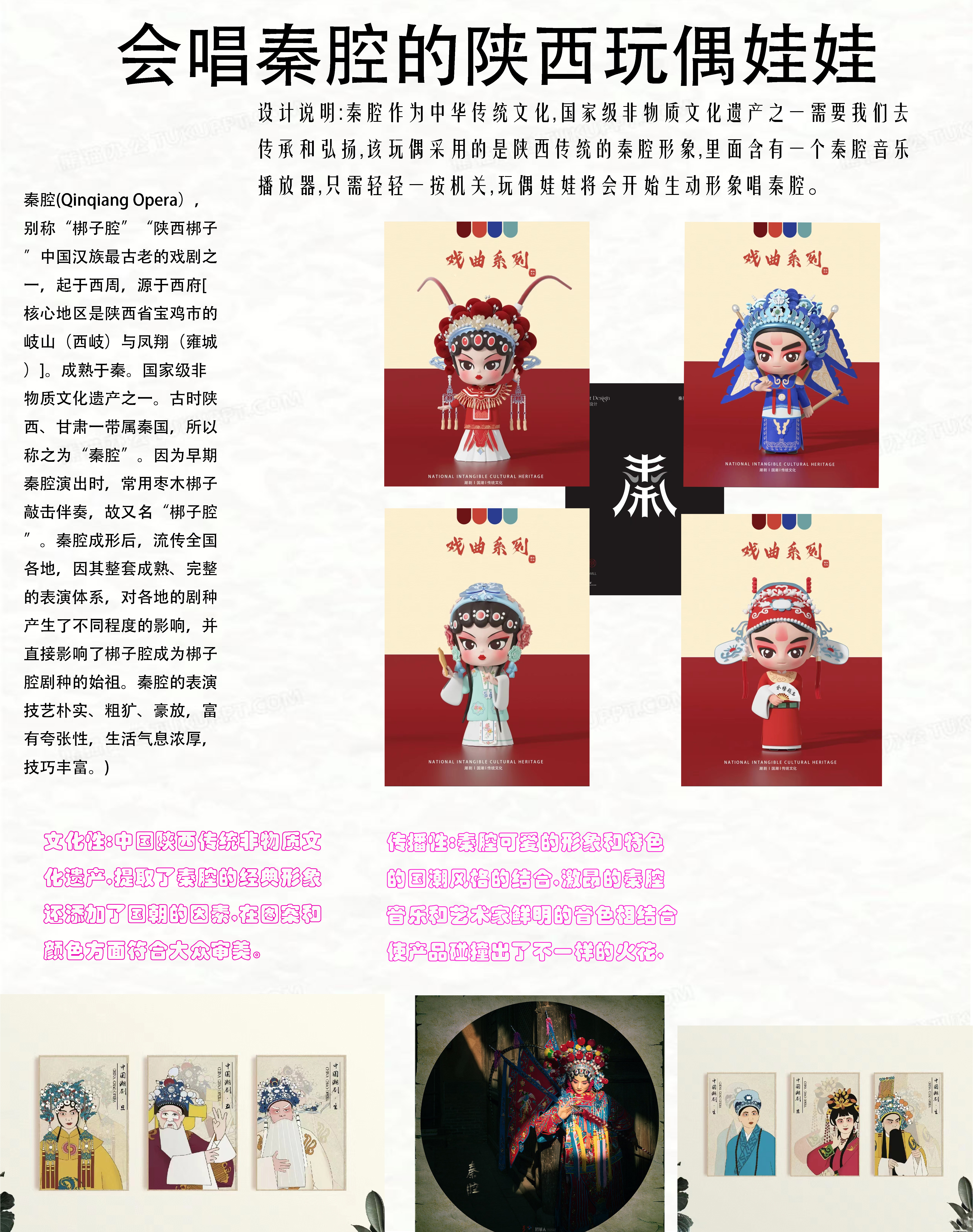 随着现代科学技术的发展,人们对中国传统文化越来越越来越淡化。 产品设计理念:本产品有四个国潮秦腔娃娃的形象,玩偶背部有按钮,按动后里面装有秦腔乐曲的播放器会开始播放传统秦腔曲目,激昂人心引人入胜。国潮的 形象设计更加受儿童青少年和当代年轻人的喜爱。既传播的陕西的传统非物质文化遗产又增加了其知名度!
