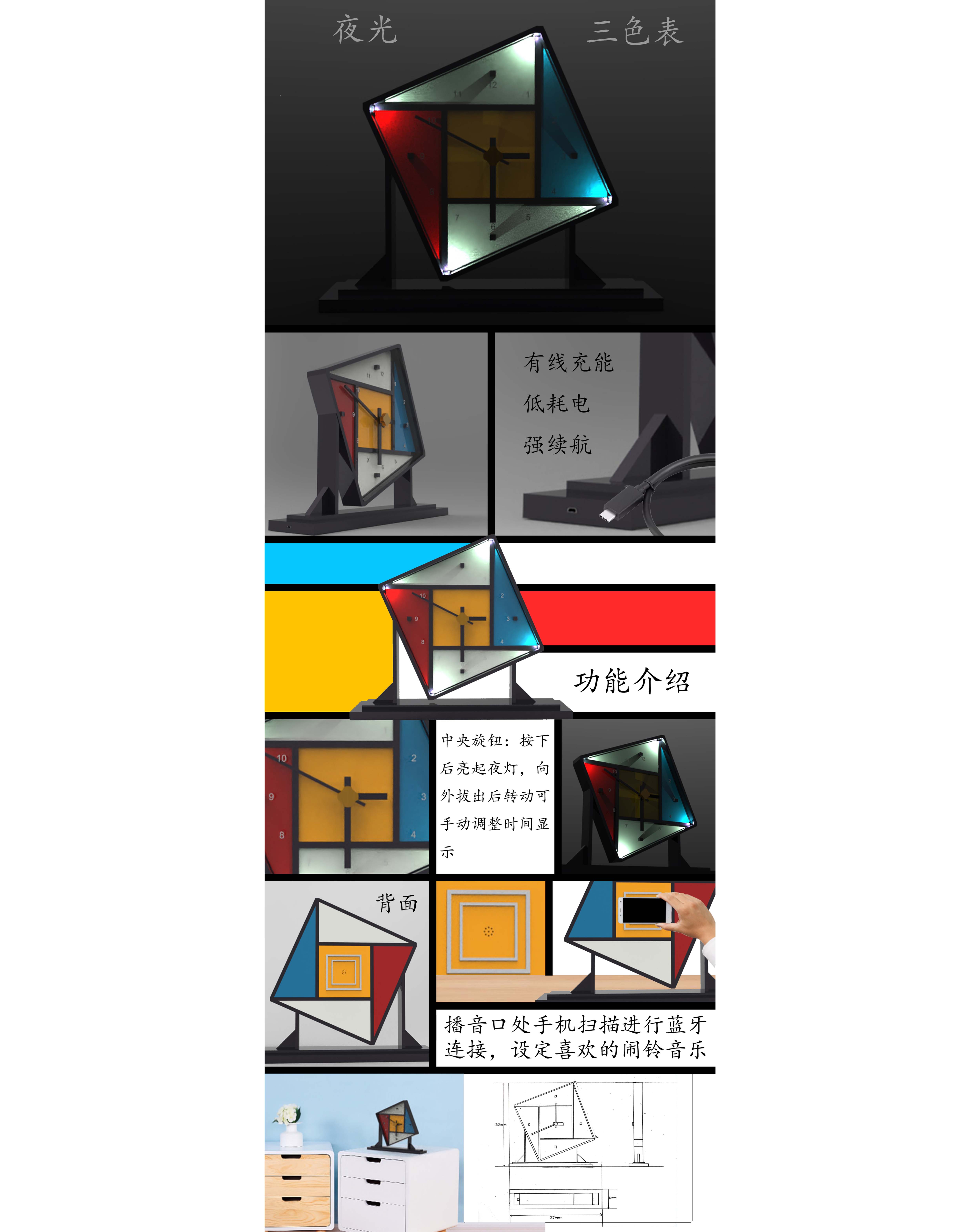 一款在外形设计上将现代化钟表与荷兰设计师蒙德里安风格结合、在功能上将传统时钟与智能蓝牙技术相结合的家居使用钟表。