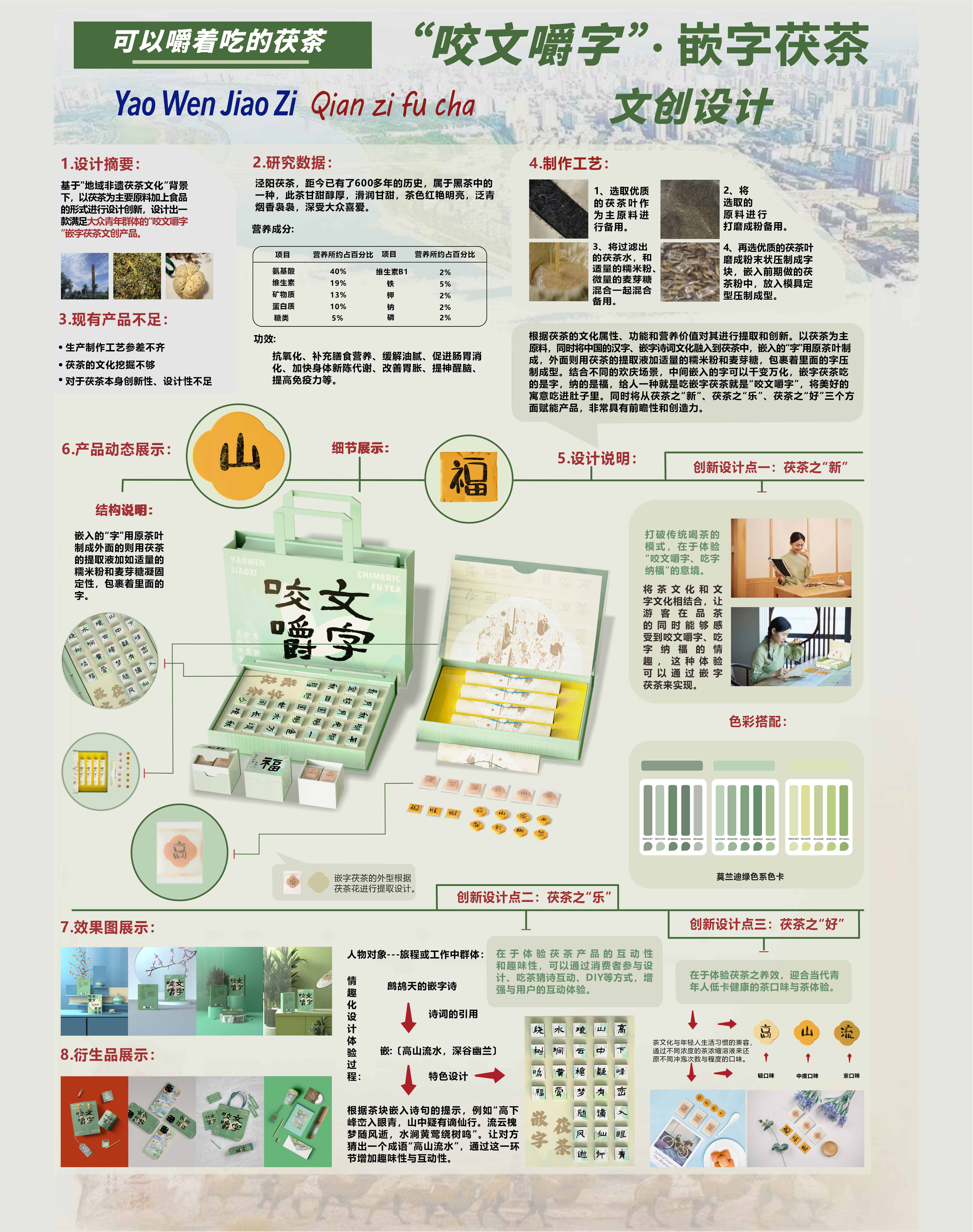 从茯茶文化属性、功能和营养价值对其进行提取和创新。以茯茶为主原料,将中国汉字、嵌字诗词文化融入到茯茶中,嵌入的字用原茶叶制成,外面用茯茶提取液加适量糯米粉和麦芽糖,包裹着里面的字压制成型。结合不同欢庆场景,中间嵌入的字可以千变万化,嵌字茯茶吃的是字,纳的是福,给人一种就是吃嵌字茯茶就是“咬文嚼字”,将美好寓意吃进肚子里。同时将从茯茶之新、茯茶之乐、茯茶之好三个方面赋能产品,非常具有前瞻性和创造力。