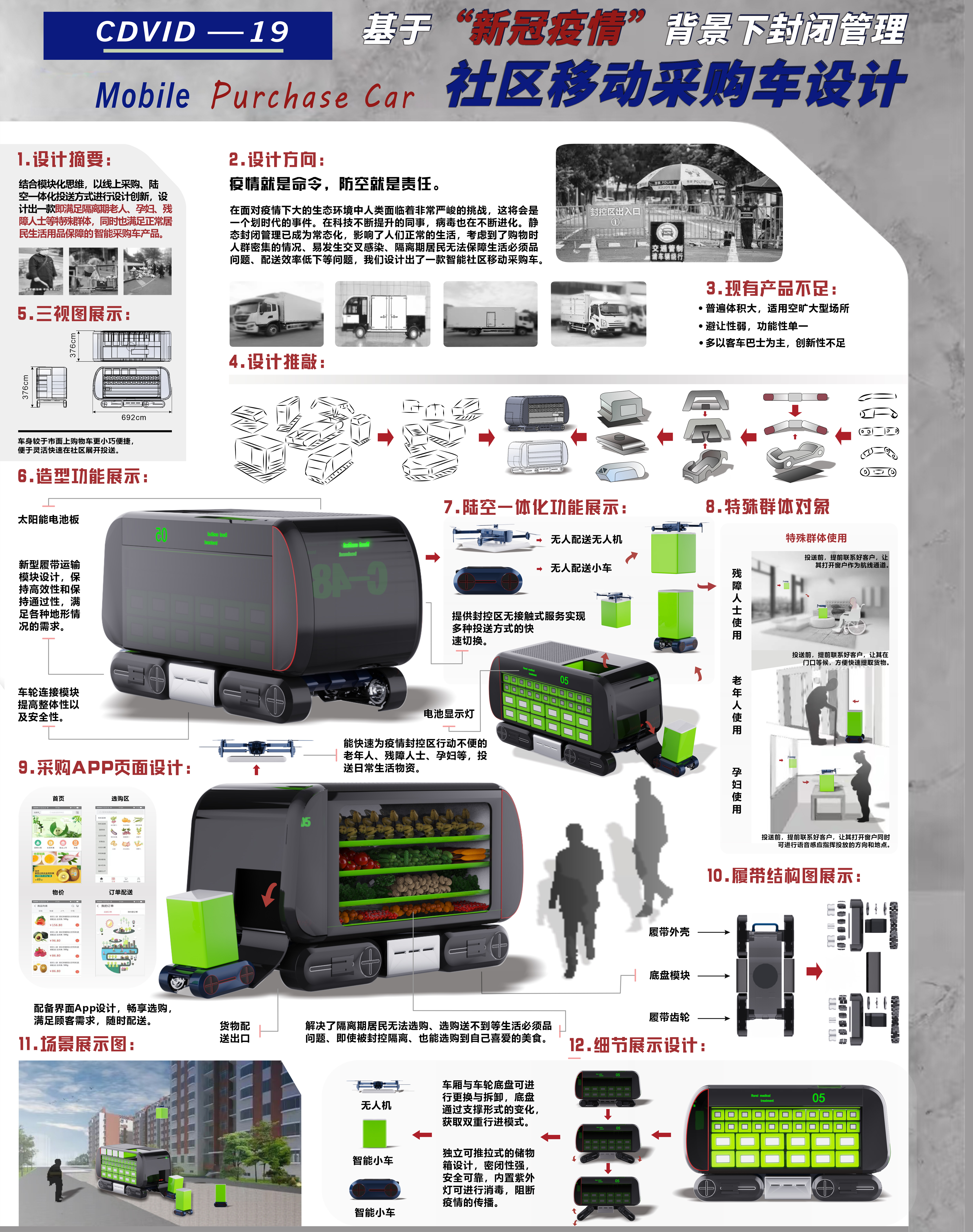 结合模块化思维,以线上采购、陆空一体化投送方式进行设计创新,设计出一款即满足隔离期老人、孕妇、残障人士等特殊群体,同时也满足正常居民生活用品保障的智能采购车产品。